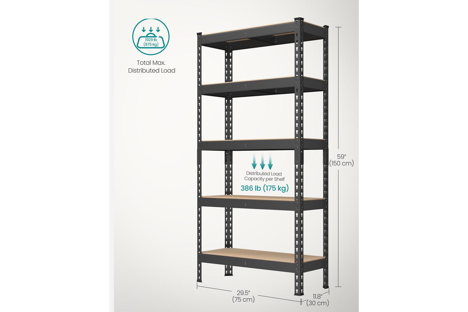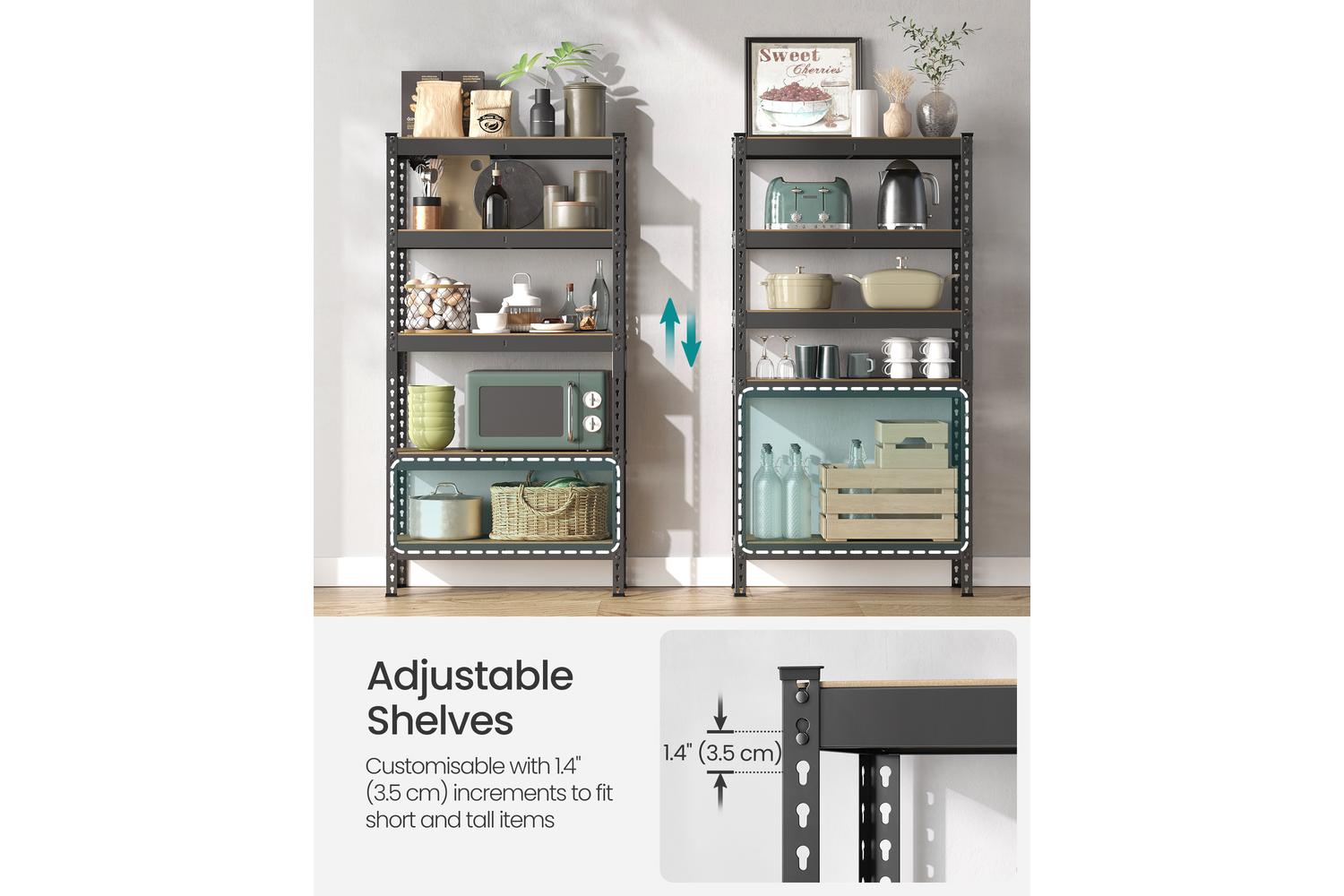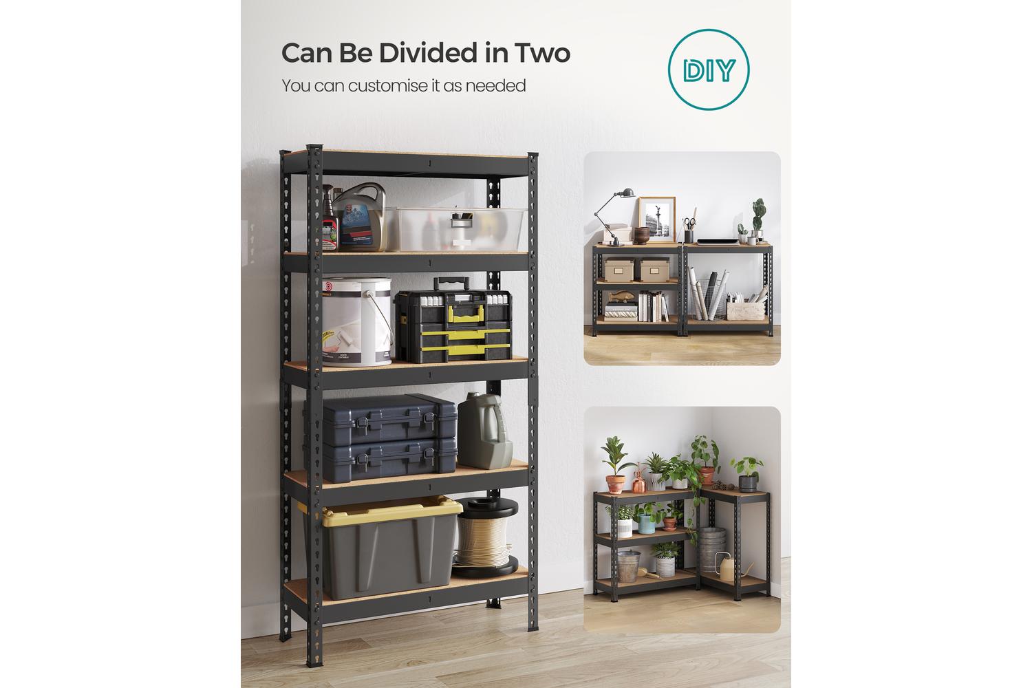 One of the standout features of the SONGMICS Shelving is its height-adjustable design. Each shelf can be repositioned every 3.5 cm, allowing you to customise the layout to fit items of varying sizes. Store tall paint cans, compact toolboxes, or awkwardly shaped sports equipment with ease. The flexibility does not end there—each unit can be split into two separate shelves, giving you the freedom to arrange them side by side, in an L-shape, or as standalone units to suit your space.