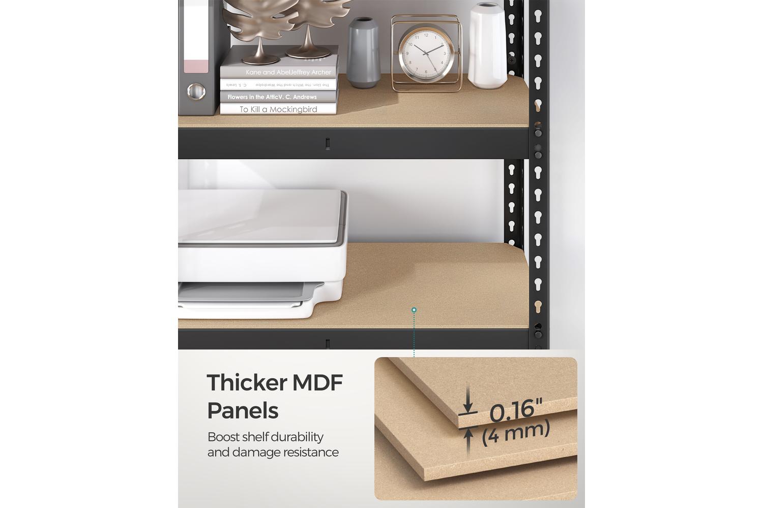 - Heavy-duty steel frame with solid MDF shelves