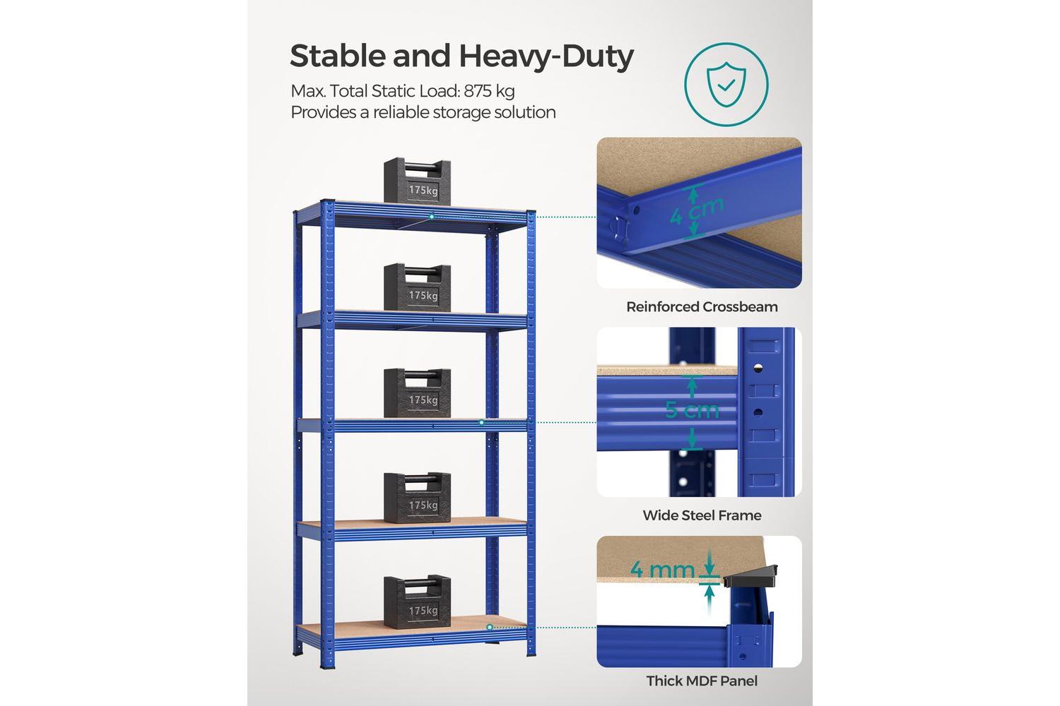 Each shelf supports up to 175 kg, giving you a total load capacity of 875 kg across the entire unit. Whether you are storing paint tins, power tools, or bulky boxes, you can trust this shelving to keep your items safe and secure. The rust-resistant steel frame and reinforced crossbars ensure long-lasting durability, even in busy garages or workshops.
