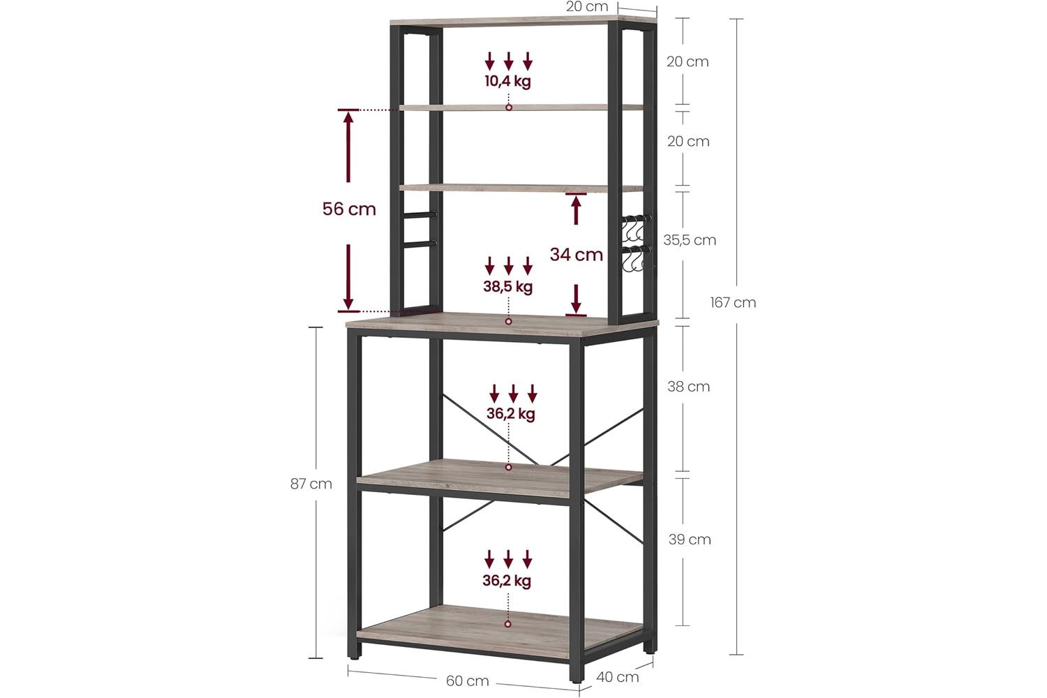 Measuring 40 x 60 x 167 cm, this kitchen organiser offers ample storage without taking up too much floor space. The sturdy steel frame and high-quality wood chipboard shelves provide reliable support, with each top shelf holding up to 10.4 kg, the spacious middle work surface supporting up to 38.5 kg, and the lower shelves accommodating heavier items with ease. Whether you are storing pots, pans, or your favourite cookbooks, you can trust this unit to keep everything safe and secure.