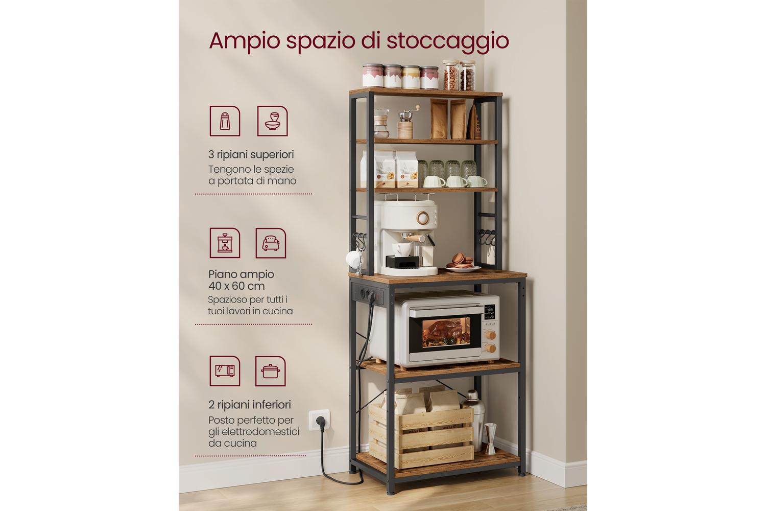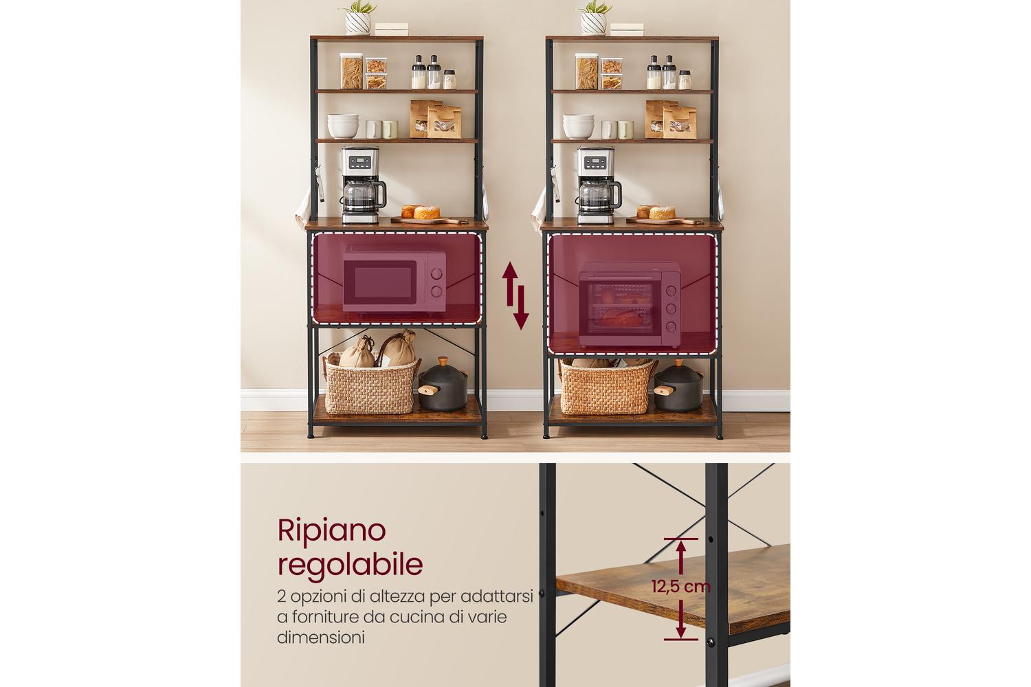 Featuring a clever 6-tier design, the VASAGLE Kitchen Shelf offers three upper shelves ideal for storing bottles, spices, or decorative items, while the three spacious lower shelves are perfect for kitchen appliances like your microwave, coffee maker, or air fryer. The adjustable centre shelf allows you to customise the space to fit taller items such as blenders, pots, and pans, ensuring everything has its place. With six handy S-hooks included, you can keep utensils, towels, or oven mitts within easy reach, making meal prep and clean-up a breeze.