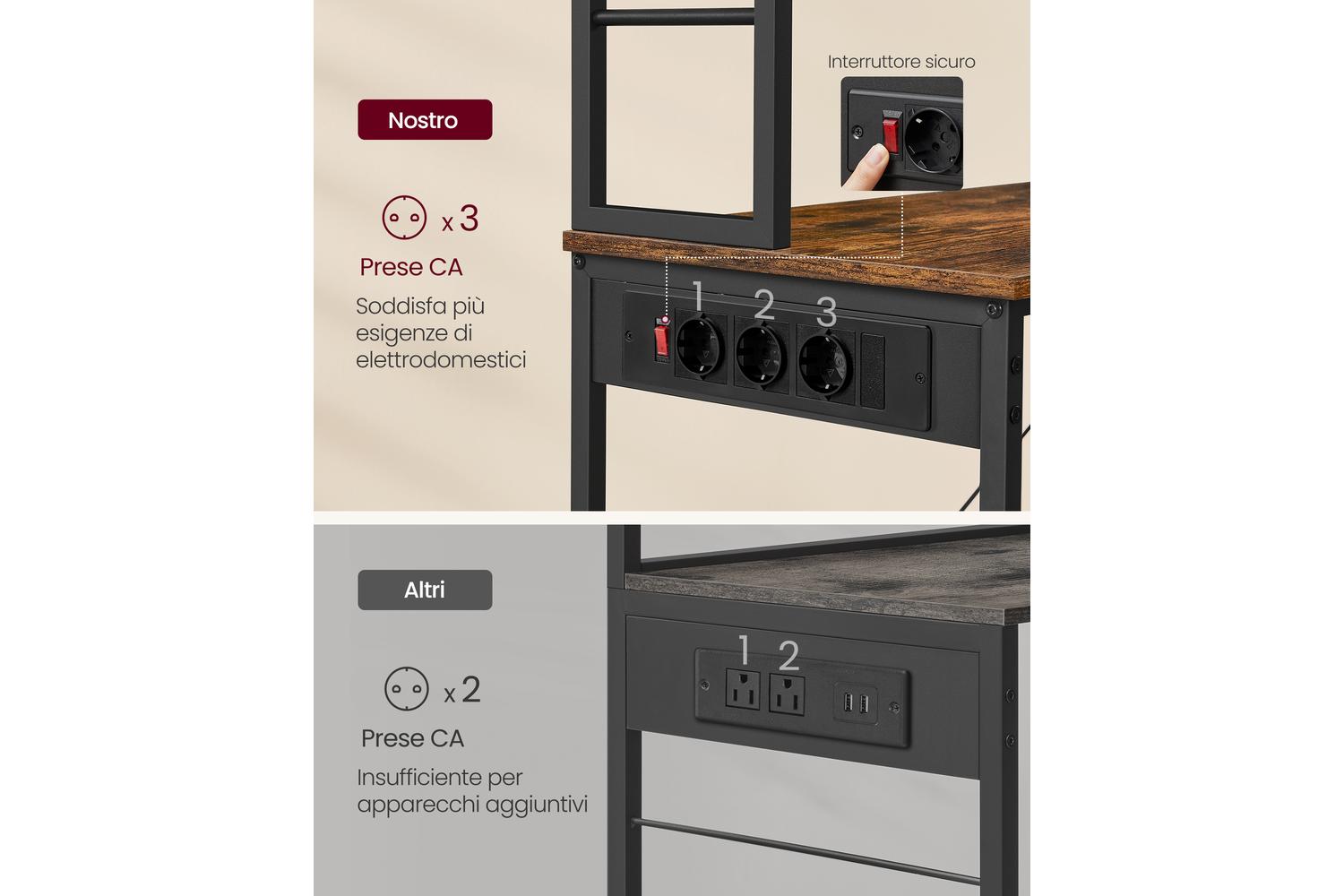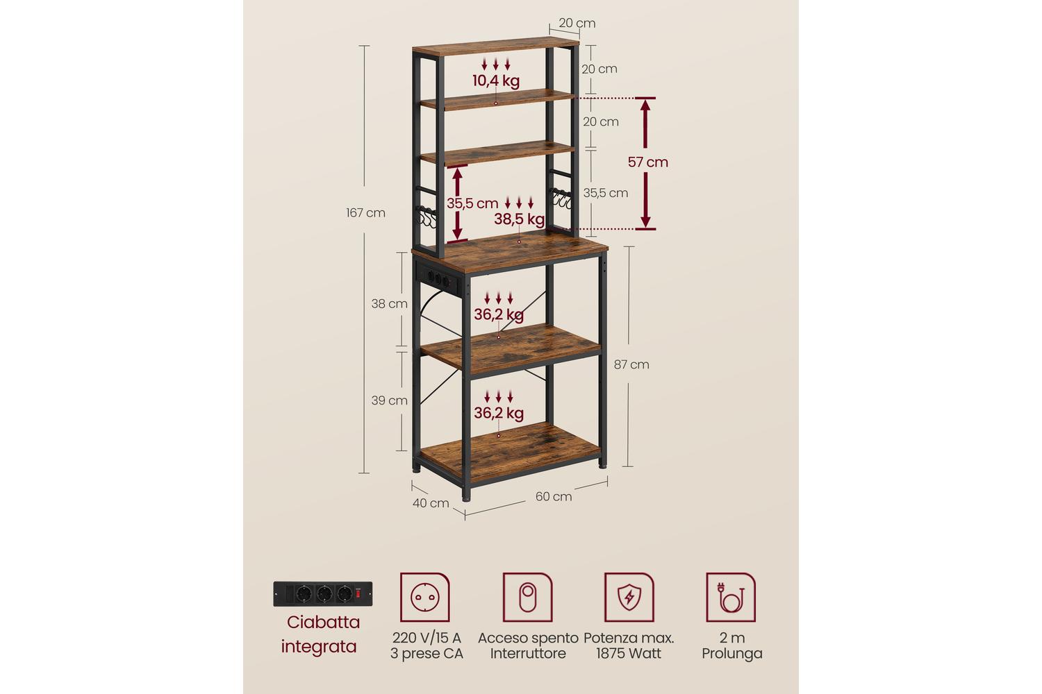 Measuring a compact 40 x 60 x 167 cm, this kitchen shelf is perfect for small kitchens, apartments, or even as a stylish mini bar in your living space. The integrated three power outlets add extra convenience, letting you plug in appliances right where you need them. With its sleek, modern look and practical features, the VASAGLE Kitchen Shelf is a must-have for anyone seeking smart storage solutions in Ireland.