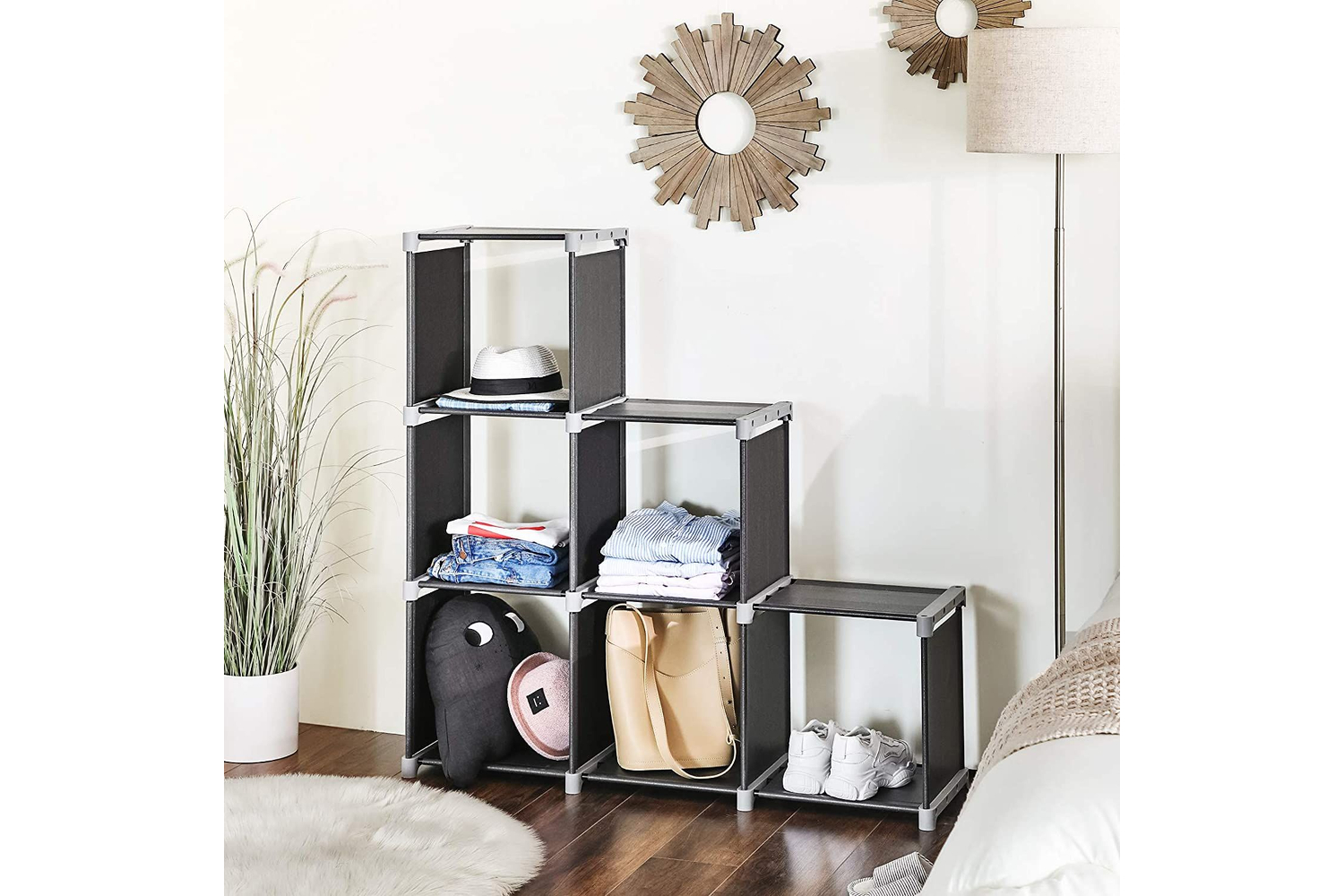 This Songmics 6-Cube Organizer will help you keep your home neat, tidy and organized, offer ultimate convenient for your household organization. This Songmics cubical organizer is versatile and can be used for storing all sorts of items such as artworks, toys, books, folding clothes or other household necessities. Apply rooms from living area to kids’ rooms to meet your various storage needs. We still carry a set of 6 fabric drawers in 3 colors to match this shelf, you can search “Songmics Fabric Drawer” and purchase at the same time.