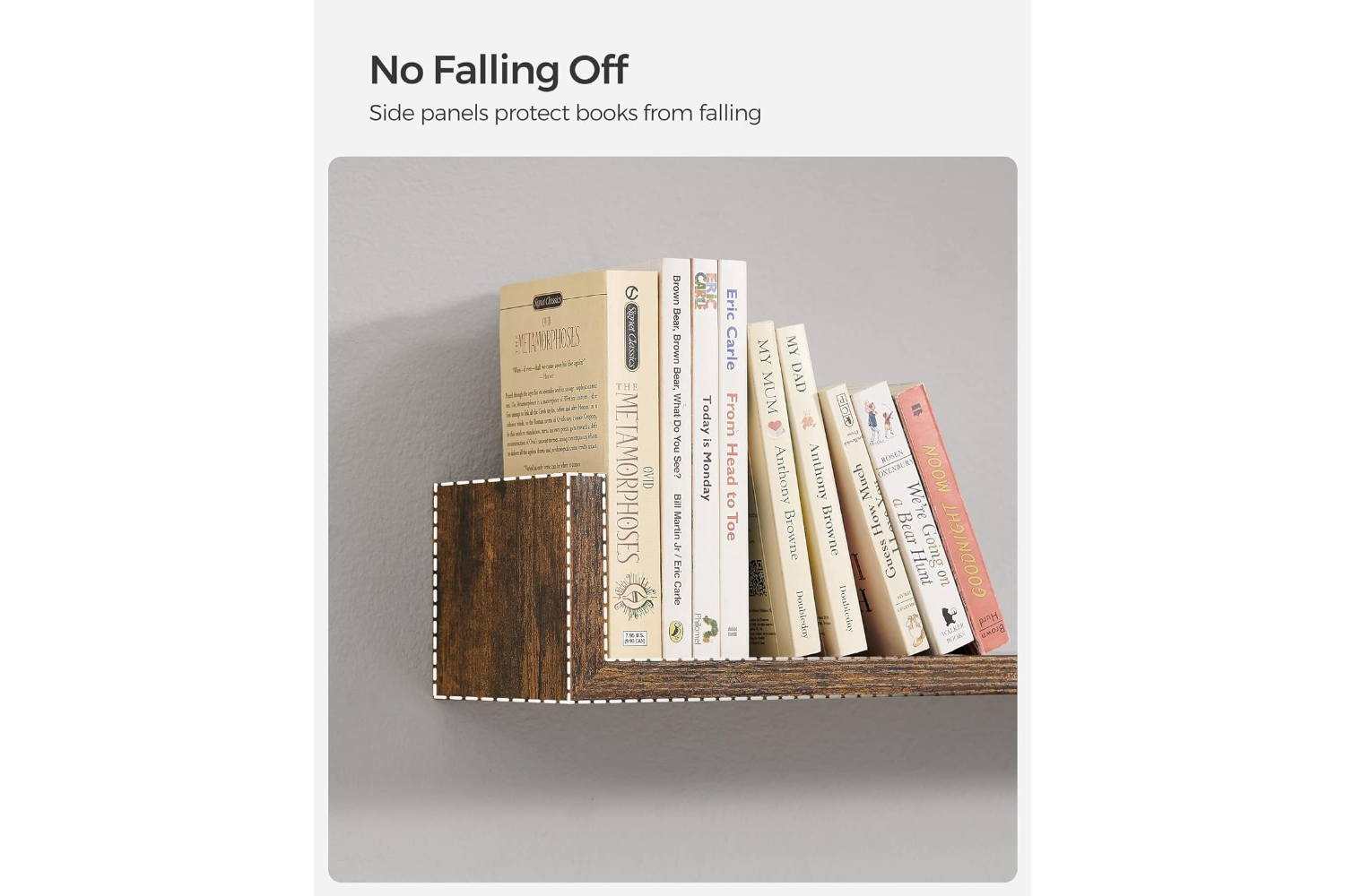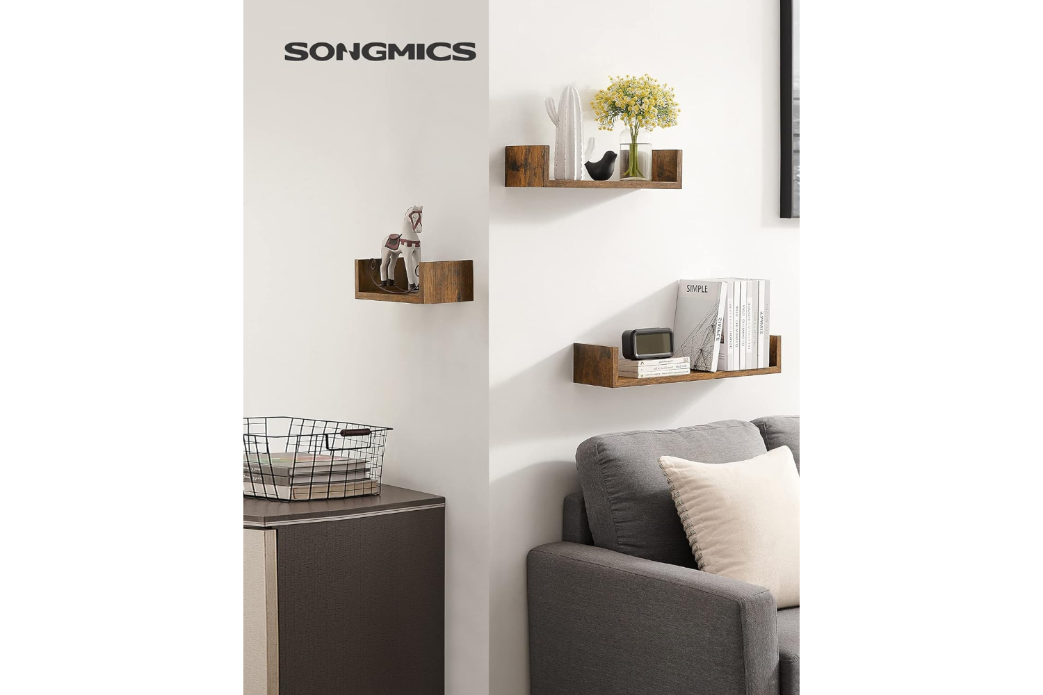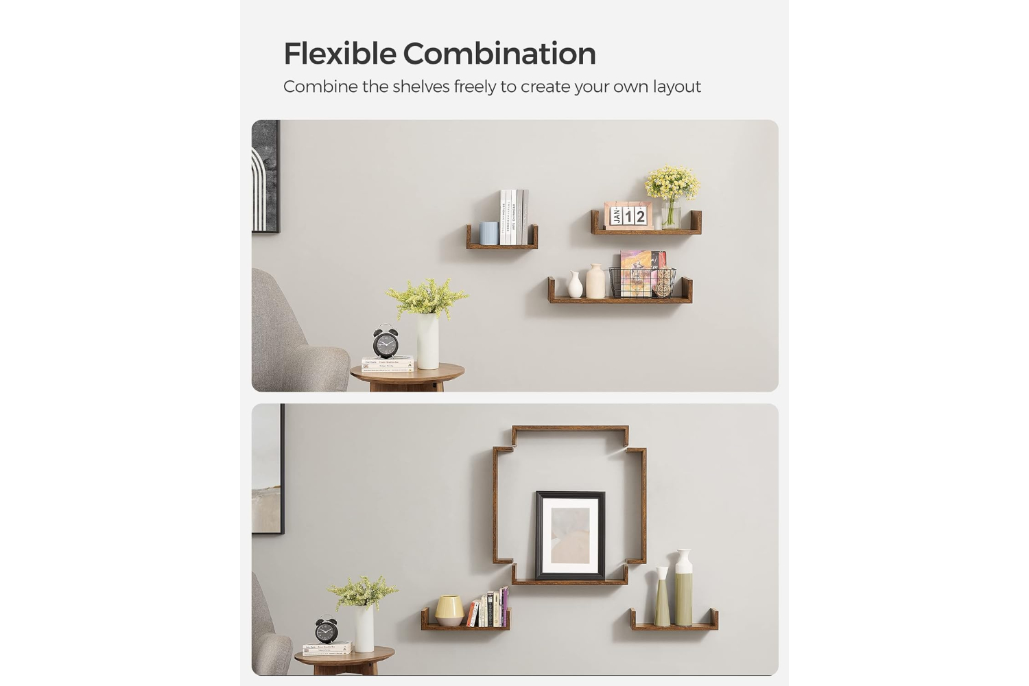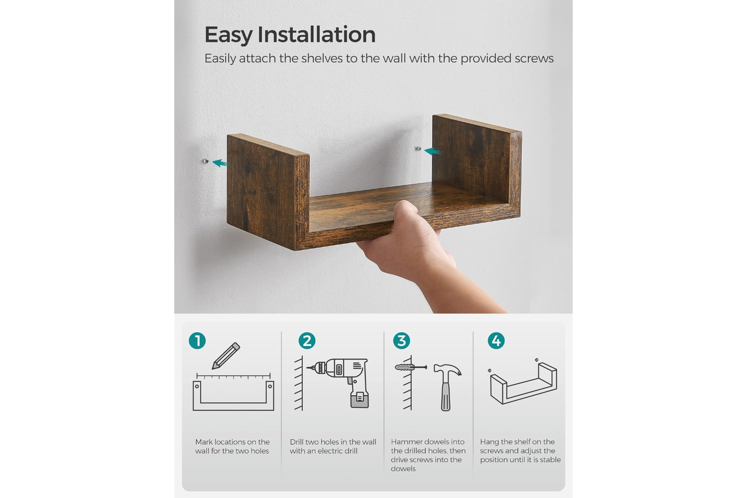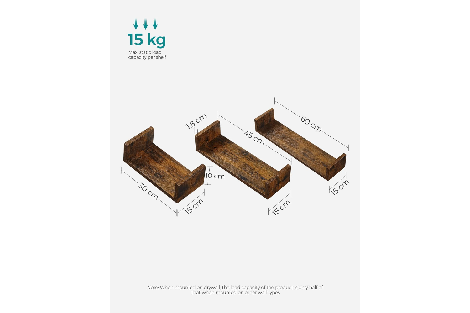 [Order with Style] The 3 shelves feature a vintage brown finish and can be flexibly combined to add style and character to your empty walls. You can also store decorations or picture frames neatly on the shelves[Robust and durable] The floating shelves are also made of high-quality chipboard and are strong, robust and durable. Each wall shelf can withstand a weight of up to 10 kg[Protection from falling off] The side walls of the wall shelves protect your books, CDs or DVDs from falling off and ensure a safe environment[Assembly - a breeze] Drill holes in the wall, attach bookshelves to the wall with the included screws - very easy! We also provide illustrated instructions with[What you get] 3 wall shelves in unique U-shape that do not take up floor space and still create additional storage space in the living room, home office, bathroom or kitchenSpecifications:- Colour: Rustic Brown- Material: Particleboard- Small Shelf Size: 30 x 15 x 10cm (L x W x H)- Medium Shelf Size: 45 x 15 x 10cm (L x W x H)- Large Shelf Size: 60 x 15 x 10cm (L x W x H)- Product Weight: 3.3 kg- Max. Static Load Capacity of Each Shelf (Solid Wall): 15 kg- Max. Static Load Capacity of Each Shelf(Drywall): 3/4/5 kg (Small, Medium, Large)Package Contents:- 3 x Wall Shelf- 1 x Accessory Kit- 1 x Instructions (EN, DE, FR, ES, IT)