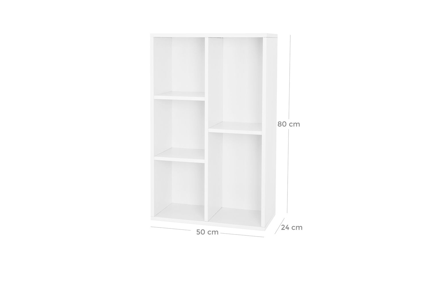 For Book-Lovers with Taste: This modern bookcase in compact size (50 x 24 x 80 cm) effectively saves floor space and blends well with other furnishing styles, provides storage room for your beloved book collections and DVDsSolid Construction: The white particleboard of this standing bookshelf are fixed by furniture cam lock fasteners for added stability; easy-care and scratch-resistant melamine veneer for the surfacePlenty of Storage Space: The bookcase has 5 compartments for books, DVDs, CDs, potted plants, and decorations (each cubby holds up to 10 kg); 2 large compartments are perfect for organising files in your officeCare for the Details: Screw holes are invisible from the outside; the bookshelf includes bottom pads to protect the floor from scratchesVersatile Shelf: Not only perfect as a bookshelf but also can be used as a TV stand when horizontally placed; stable structure allows you to do soSpecifications: - Colour: White - Material: Particleboard- Product Size: 50 x 24 x 80 cm (L x W x H) - Product Weight: 10.5 kg- Max. Static Load Capacity per Shelf: 10 kg Package Contents: - 1 x Bookshelf - 1 x Assembly Kit- 1 x Anti-Tip Kit- 1 x Instructions