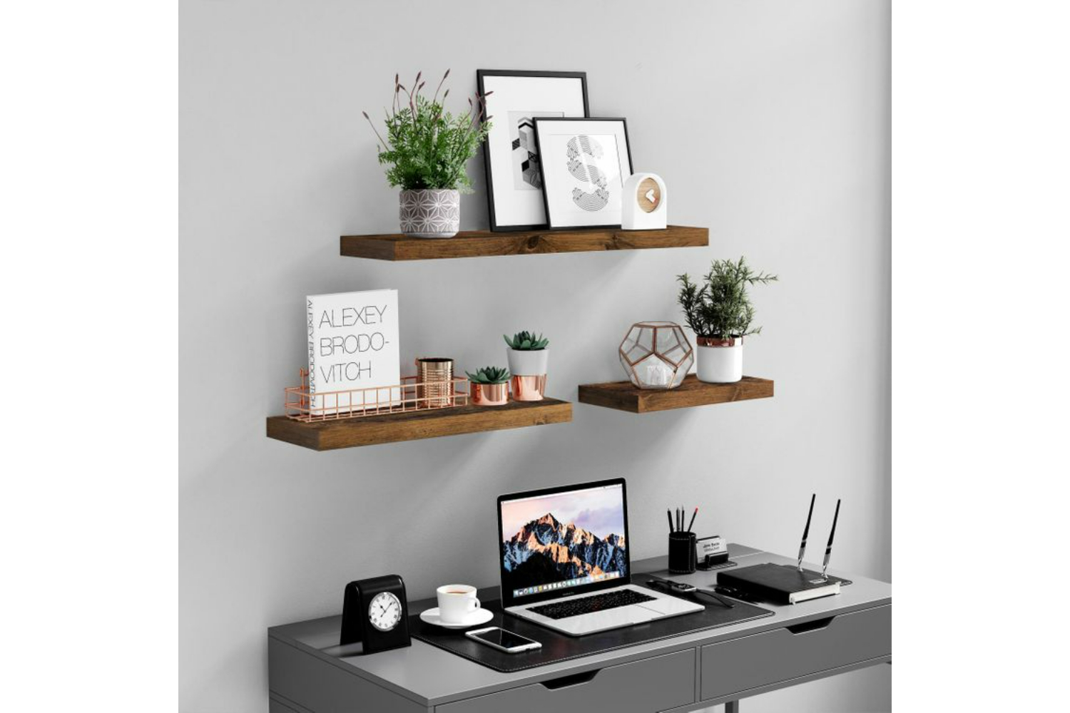 There is not enough space on your floor to put a narrow shelf there? So what to do with your decorative items, picture frames, collections or spices? Set your sights on your walls! Use the rustic brown floating shelf in the living room to display your family photos, in the bathroom to store soap and other toiletries, or in the kitchen to stock up on condiments place.