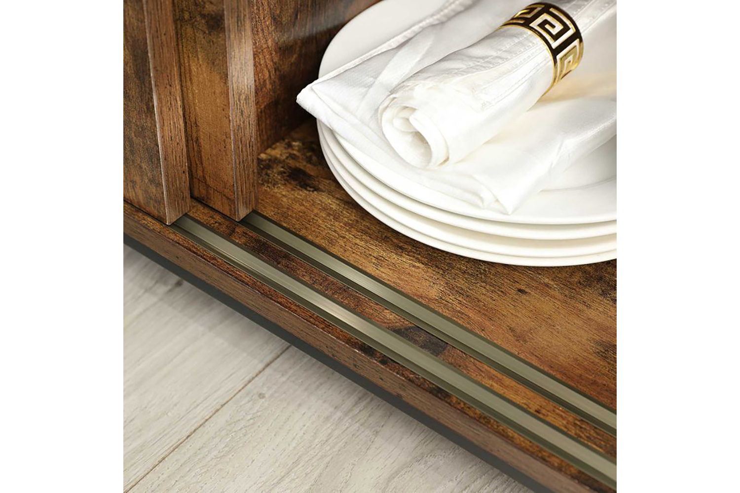 The doors of this sideboard give it its unique look and glide smoothly past each other. Slide one door over the other, leaving one side of the cabinet open to reveal decorations stored behind