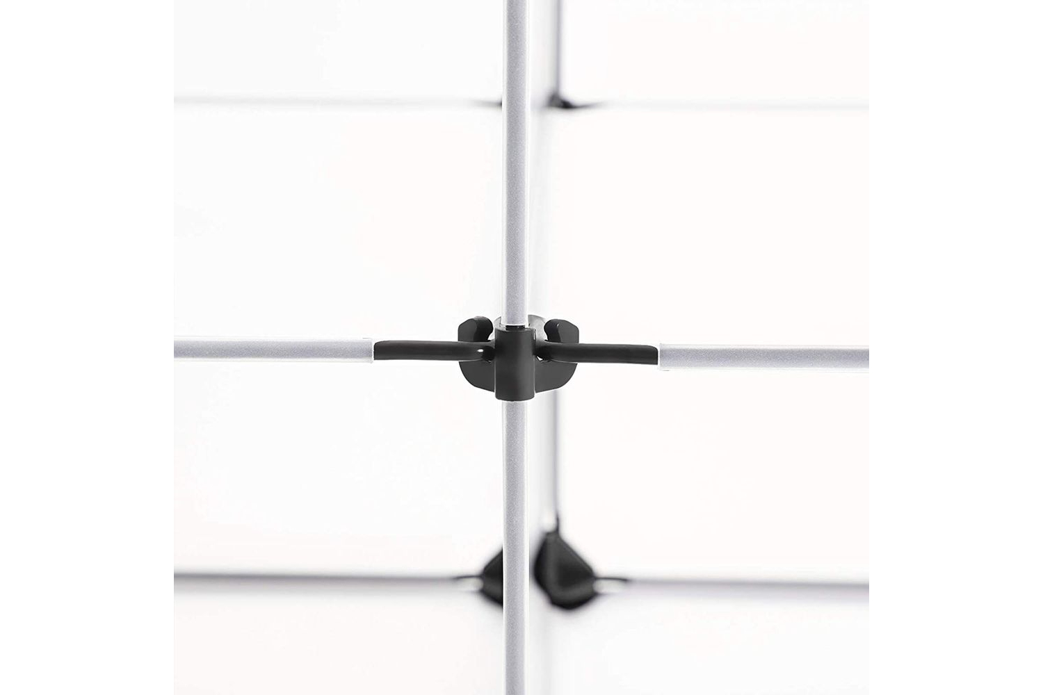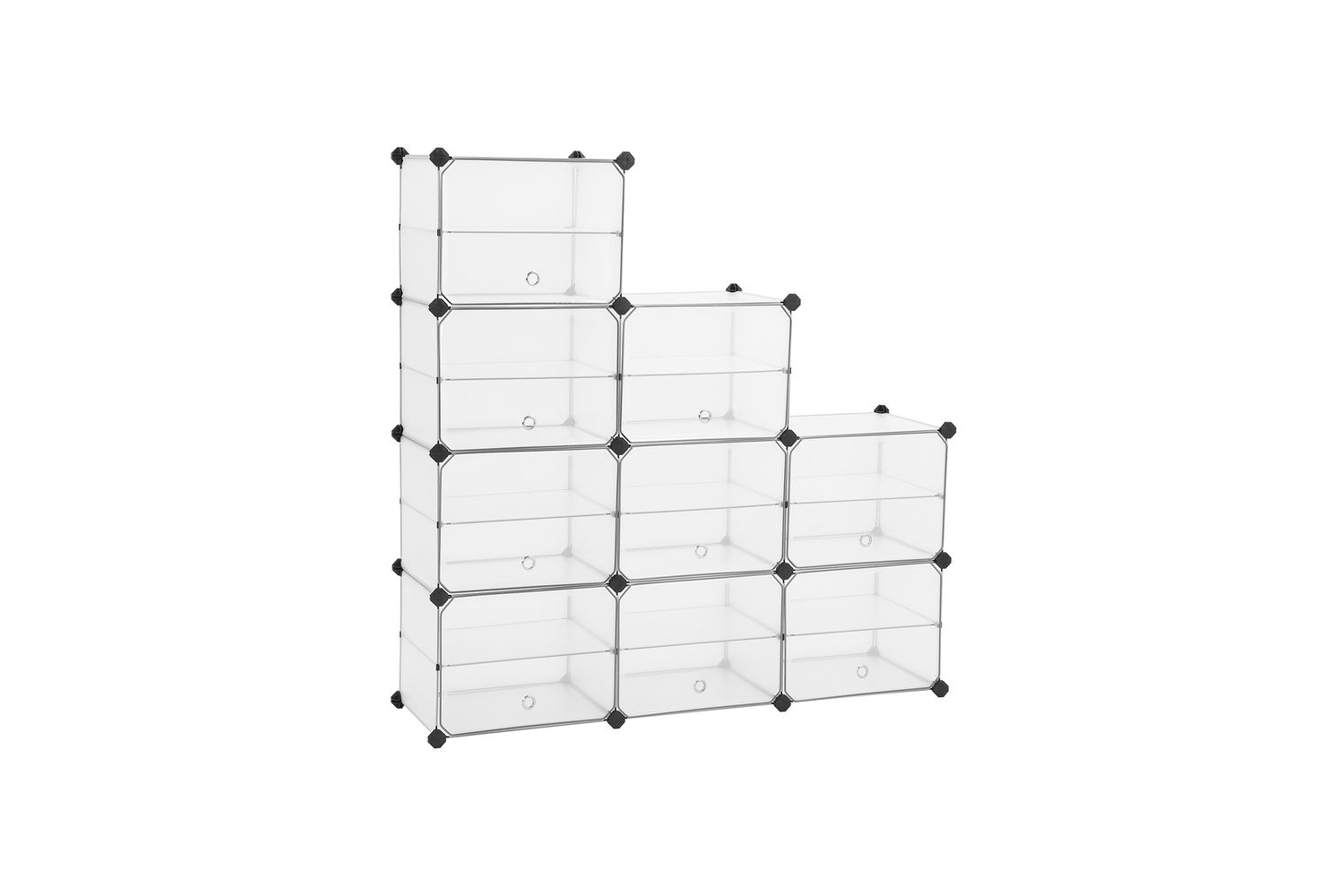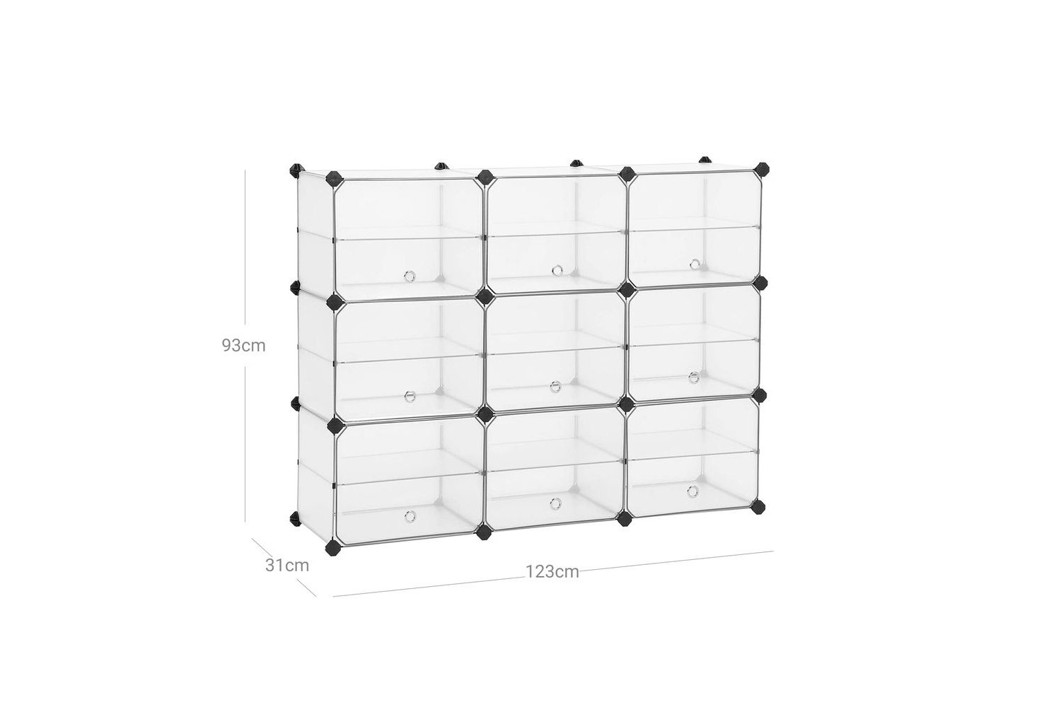 SAY STOP TO MESS: Need a hero to rescue your messy home occupied by scattered shoes and clothes randomly stored in a heap? This functional cube storage unit will do just the trick and bring order back homeENJOY THE EASY CLICK: We know that assembling furniture isnt a popular pastime, and thats why we use hooks to replace some connectors and make it easier; just snap the hooks on and finish with a happy click, easy peasy!KEEP DOORS CLOSED: Say goodbye to the annoying doors that dont stay shut all the way; the storage unit comes with small hooks to grip the doors tightly so the dust is always kept outFOR A MILLION PROBLEMS: Create a shoe rack under the stairs, make it a storage system in the bedroom for clothes and bags, or use it as a bathroom organiser for towels and makeup; anyway, this all-rounder is a solution for a million problemsFOR A MILLION PROBLEMS: Create a shoe rack under the stairs, make it a storage system in the bedroom for clothes and bags, or use it as a bathroom organiser for towels and makeup; anyway, this all-rounder is a solution for a million problemsSpecifications:- Colour: Translucent White- Material: PP Plastic Sheets with Metal Wire Frame, ABS Plastic Connectors- Product Size: 123 x 31 x 93 cm (L x W x H)- Product Weight: 9.3 kg- Static Load Capacity of Each Cube: 5 kg Package Contents:- 30 x Plastic Sheet (40 x 30 cm)- 13 x Plastic Sheet (30 x 30 cm)- 9 x Door (40 x 30 cm)- 34 x ABS Plastic Connector- 12 x Single Hook- 12 x Double Hook- 1 x Rubber Mallet- 2 x Anti-Tip Strap- 1 x Instructions (EN, DE, FR, ES, IT)