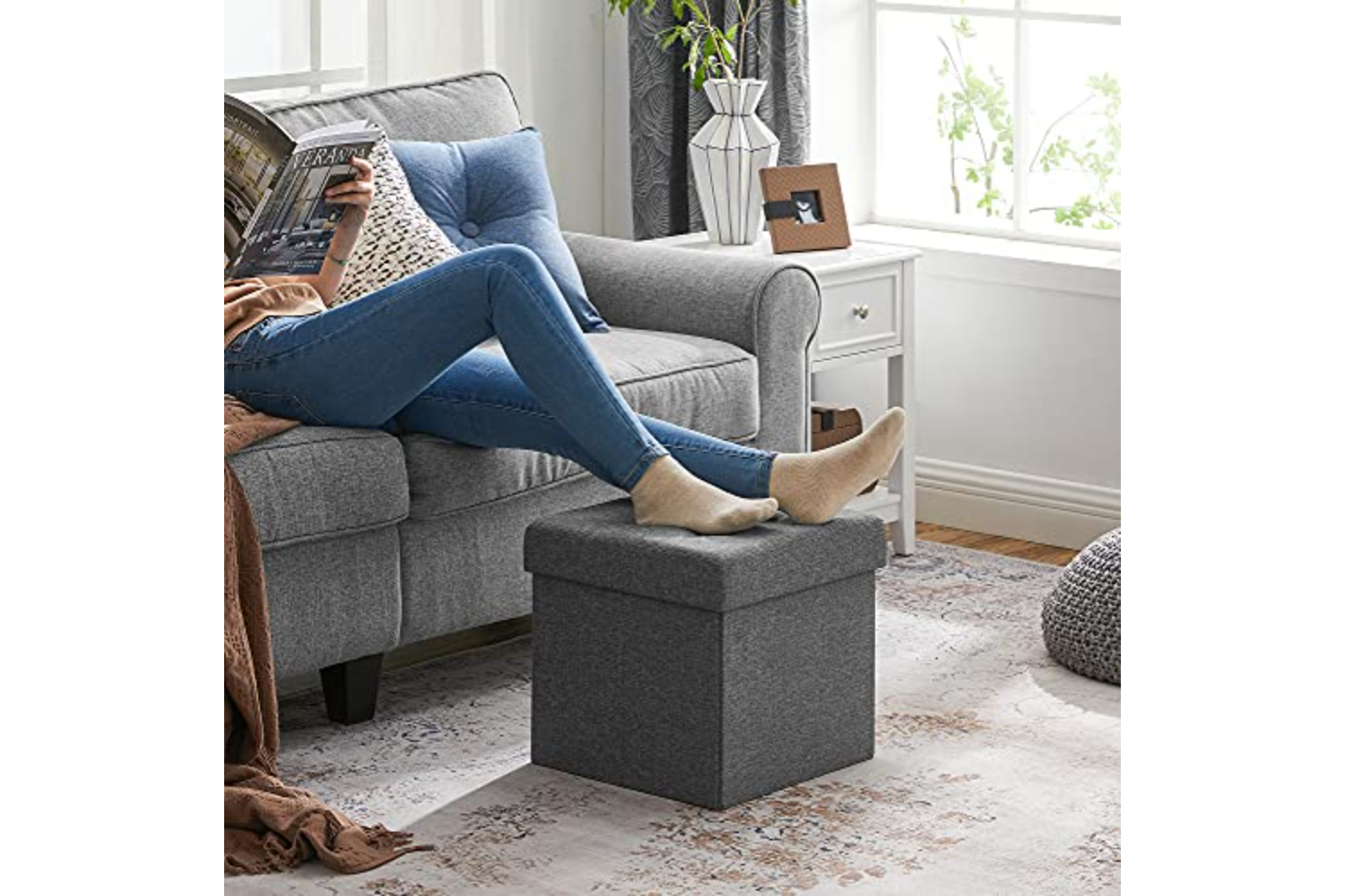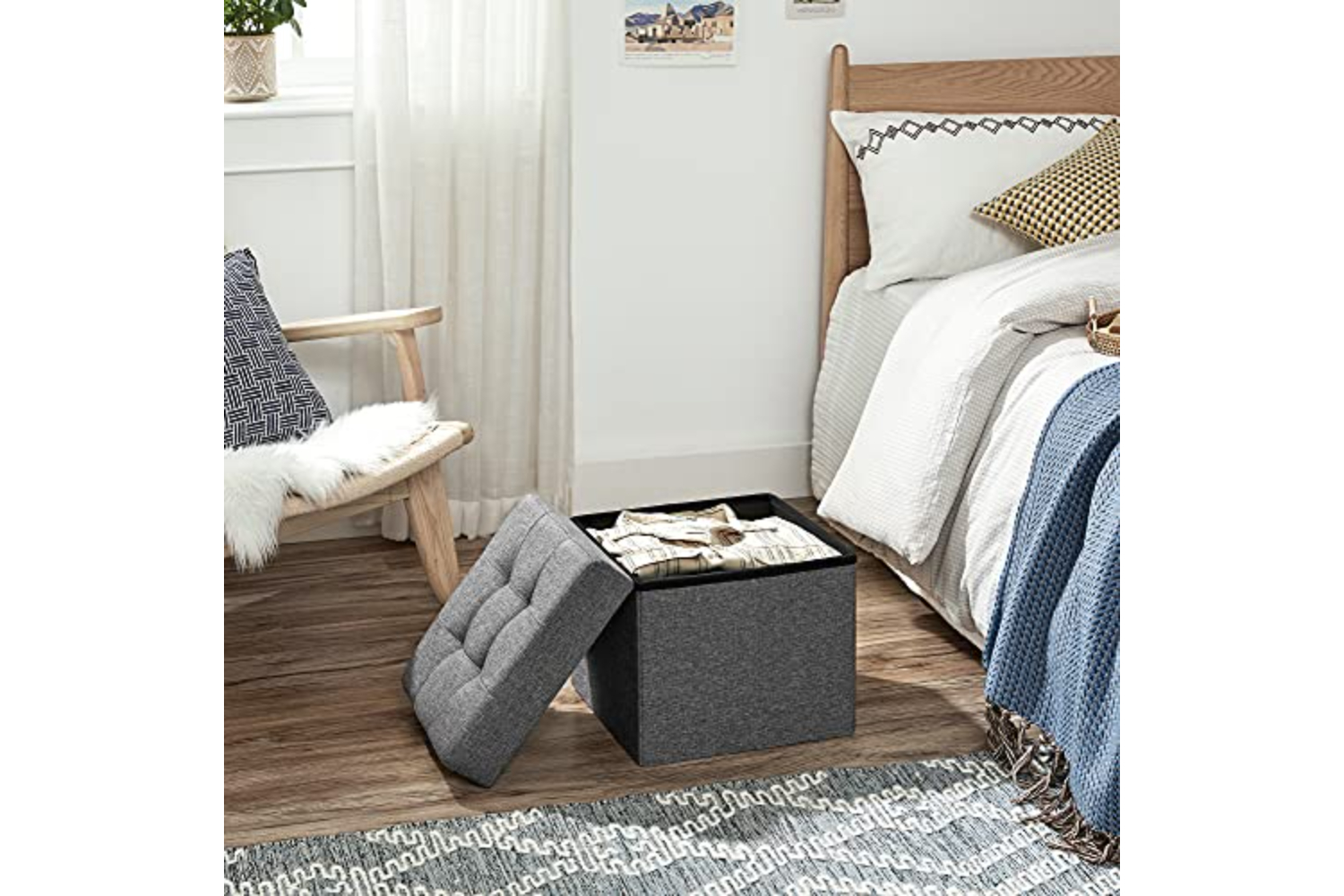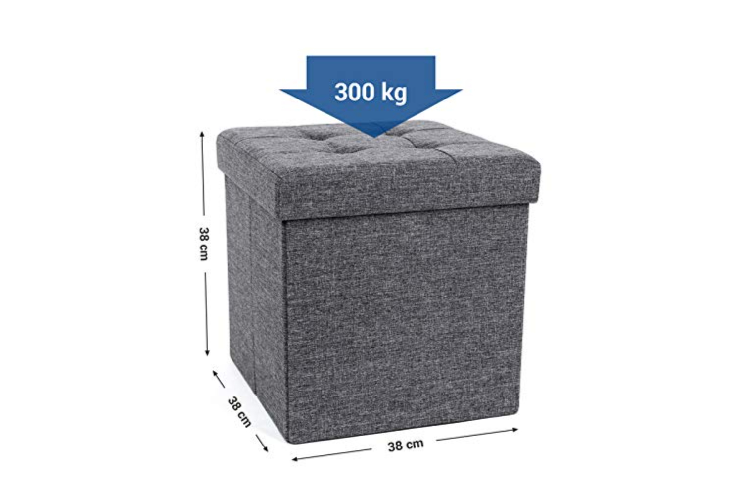 Strong and Durable Feature: made of E1 standard thick MDF, superior linen fabric and padded cushion, soft and moistureproof. No deformationHidden Storage Space: loads of storage inside as handy storage box. Spacious space 40L to hide away clutter, hold clothes, toys, magazines, blankets, bedding perfectlyDouble As An Comfortable Seat: padded with high density foam, soft and superb sturdy to sit on. The maximum weight capacity is up to 300kgExtremely Easy to Set Up: come flat packed, just take seconds to assemble. Collapsible design enables it to pack up when not in useSimple and Decorative Appearance: a delicate and versatile piece of bench can be used bedside box, bookcase or foot stool, it perfectly matches your furniture in lounge, bedroom or living roomProduct Parameters: - Dimensions: about 38 x 38 x 38 cm (W x D x H) - Inner dimensions: 34 x 34 x 33.5 cm (W x H x D) - Material: MDF + linen fabric - Color: dark gray - Weight: 3.78kg Shipping List: - 1 x Storage Ottoman