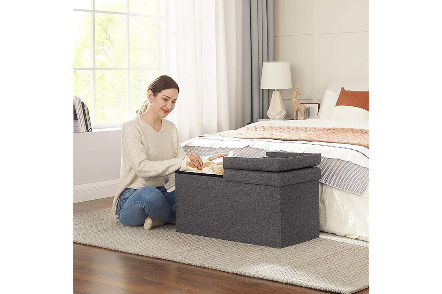 Simply lift the hinged lid on one side to easily take out everything you need from inside this storage ottoman. When your guests arrive, use it as a footrest and fold it up to save space when not in use