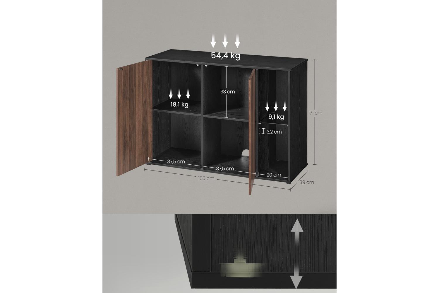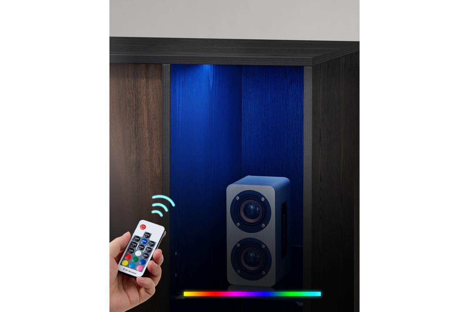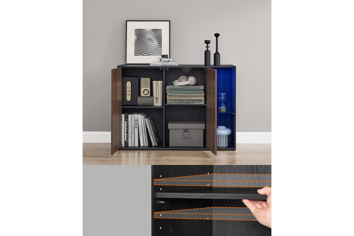 More than just a storage unit, this sideboard doubles as a display piece. The top of the open compartments is fitted with remote-controlled RGB lighting, which shines through the glass shelf to create a warm, inviting atmosphere—ideal for cosy Irish evenings or entertaining guests. Adjustable shelves offer five height levels, allowing you to customise the space for everything from books and electronics to decorative items. Integrated cable grooves in the back panel keep wires tidy and out of sight, making this cabinet perfect as a TV stand or media unit.