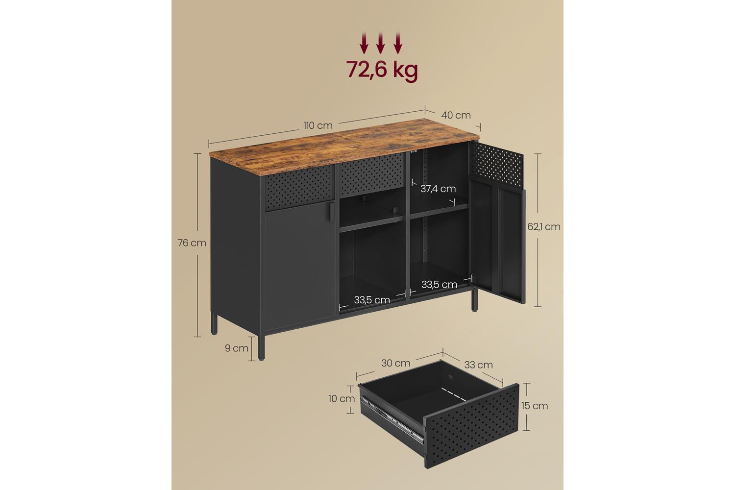 Engineered for flexibility, the SONGMICS Storage Cabinet features a spacious top shelf ideal for your coffee maker, microwave, or decorative items. The handy drawer is perfect for storing utensils, remote controls, or office supplies, while two open compartments and height-adjustable shelves provide ample space for items of all sizes. The innovative cabinet body includes multifunctional holes, ensuring optimal ventilation and allowing you to attach hooks (not included) for hanging keys, kitchen towels, or other essentials.