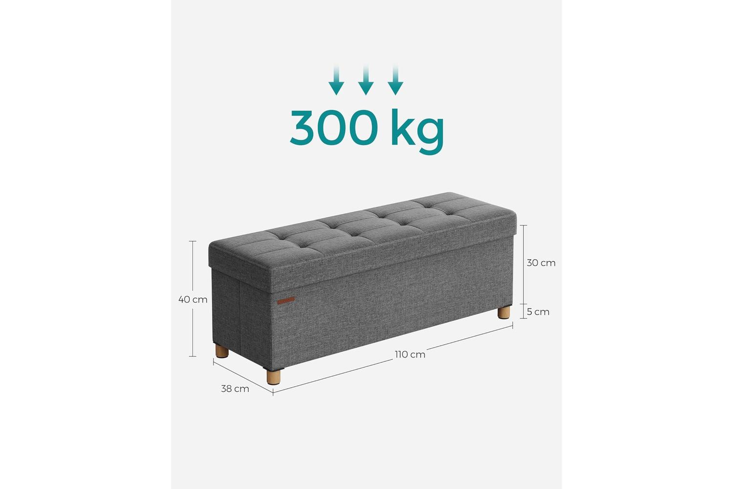 Measuring 38 x 110 x 40 cm, this storage bench fits neatly at the end of your bed, under a window, or in your hallway. Its robust construction supports up to 300 kg, making it suitable for seating multiple people. The dark grey colour complements a wide range of interiors, from contemporary apartments to cosy cottages, ensuring it looks right at home wherever you place it.