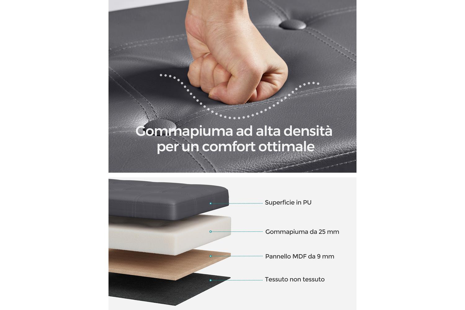 Built for durability, the SONGMICS Storage Ottoman features premium MDF panels and reinforced metal corner guards, ensuring it stands up to daily use. With a robust static load capacity of up to 300 kg (660 lb), it offers reliable seating for guests or family members. The high-resilience foam padding and double-layer fabric provide enduring comfort, making it ideal for relaxing after a long day or as a convenient footstool in your living room.