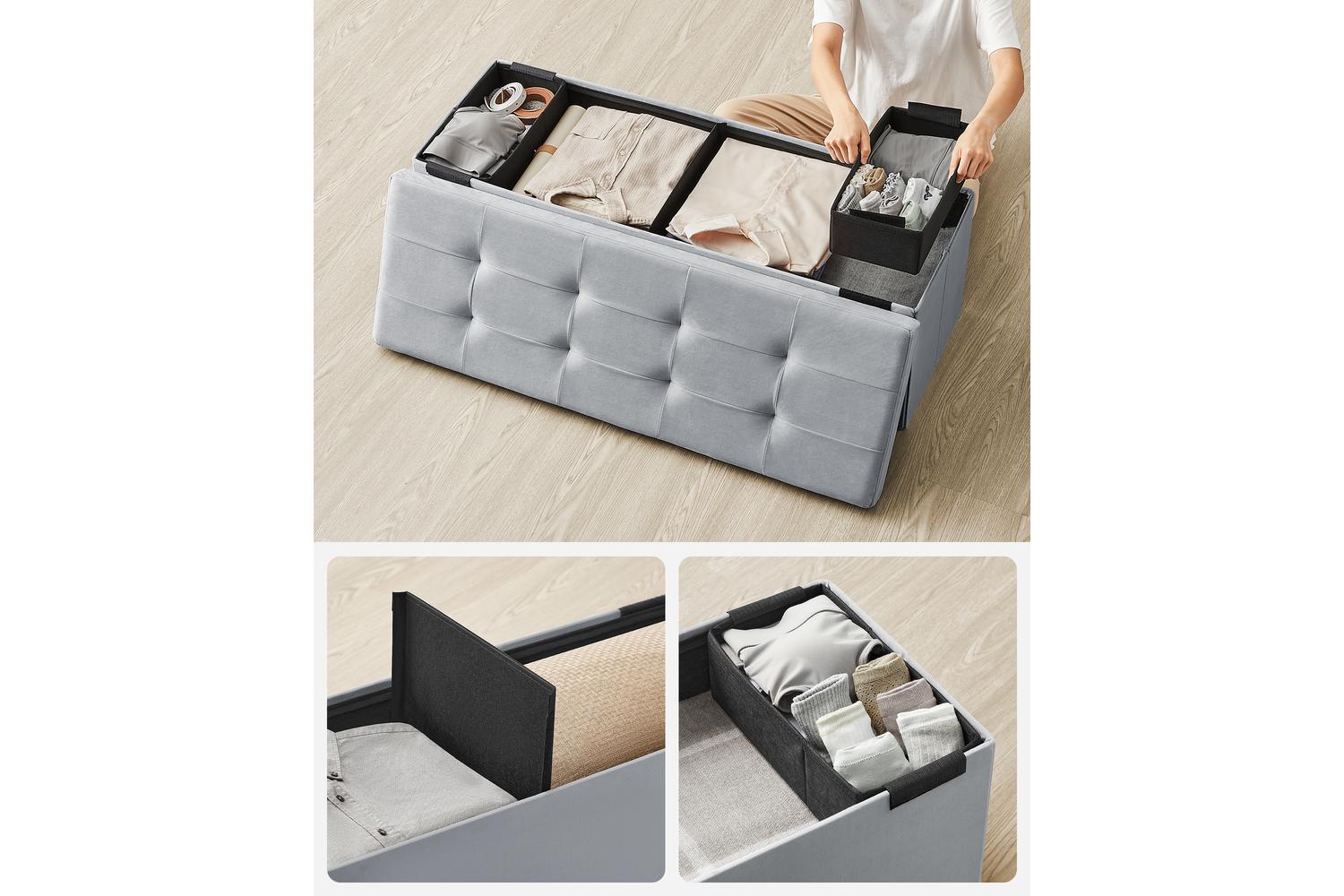 With generous dimensions of 38 x 110 x 38 cm and a spacious 131-litre capacity, this ottoman provides ample room for storing books, blankets, shoes, and more. Two handy storage boxes are included, perfect for organising socks, underwear, or other small essentials. The clever folding design allows you to set up the ottoman in seconds and fold it flat when not in use, saving valuable space in your home.
