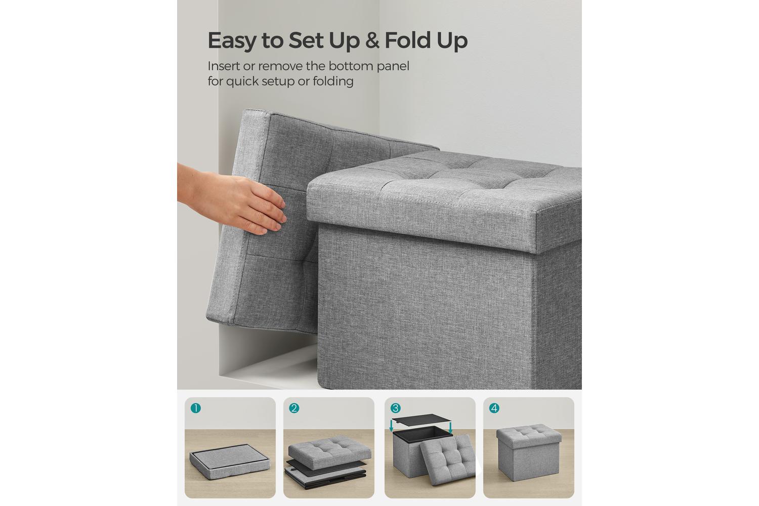 Setting up your new ottoman is a breeze – simply insert the sturdy base plate and it is ready to use. When you need to free up space, the foldable design allows you to tuck it away under the bed or in the wardrobe, making it perfect for smaller Irish homes or apartments. Its versatile design means it can be used as a storage box, footstool, coffee table, or even a dressing room seat, adapting effortlessly to your needs.