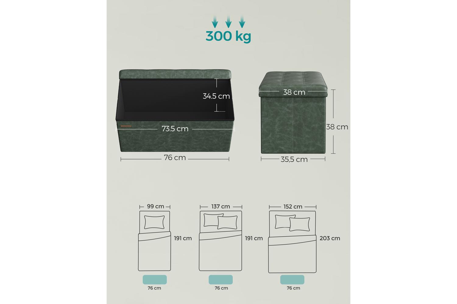 Measuring 76 x 38 x 38 cm, the SONGMICS Storage Ottoman fits perfectly at the end of your bed, under a window, or in your entryway. Its sturdy build supports up to 300 kg, providing reliable seating for guests or family members. The forest green finish adds a touch of sophistication, making it a standout piece in any room. Easy to assemble and lightweight at just 6.2 kg, you can move it around your home as needed, adapting to your changing storage needs.