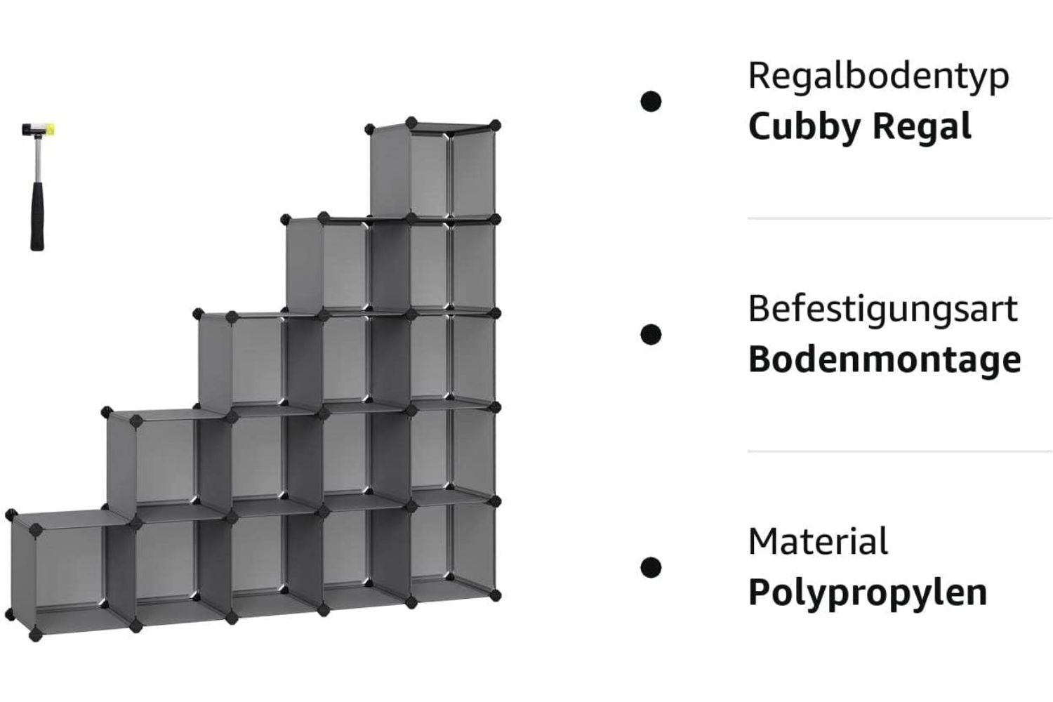 Easy plug-in technology: This set consists of a total of 56 plastic plates with integrated metal frame and 52 connectors made of ABS plastic. A small rubber hammer is also included. Using these components, this shelving unit can be set up quickly by inserting the plates into the connectors and tapping them with the hammer. Finally, you can attach the resulting piece of furniture to your wall with the tilt protection.