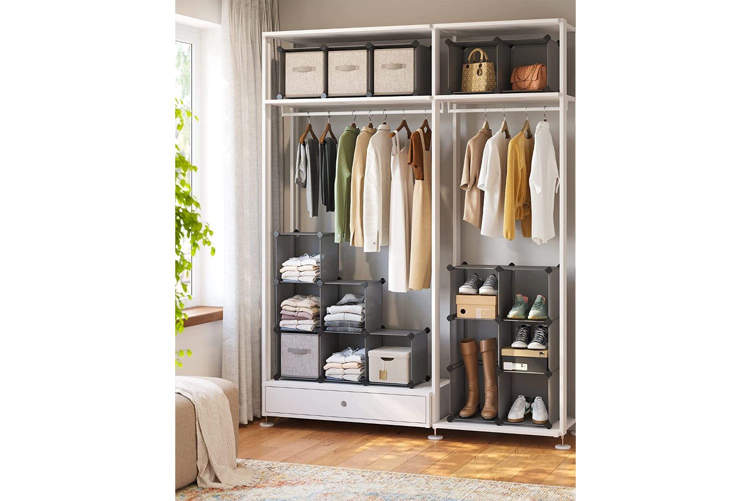 Build the shelving unit in steps and place it under your stairs in the hallway to store shoes and bags. Place the shelf system upright in your bedroom and use it as a wardrobe. Split the 16 cubes and set 3 small shelves in rooms with limited space. Place about a cupboard with 6 cubes in your bathroom to keep all your hygiene items tidy. Use the plug-in shelf system to create a spacious run for hamsters, guinea pigs, house rats etc. to build.