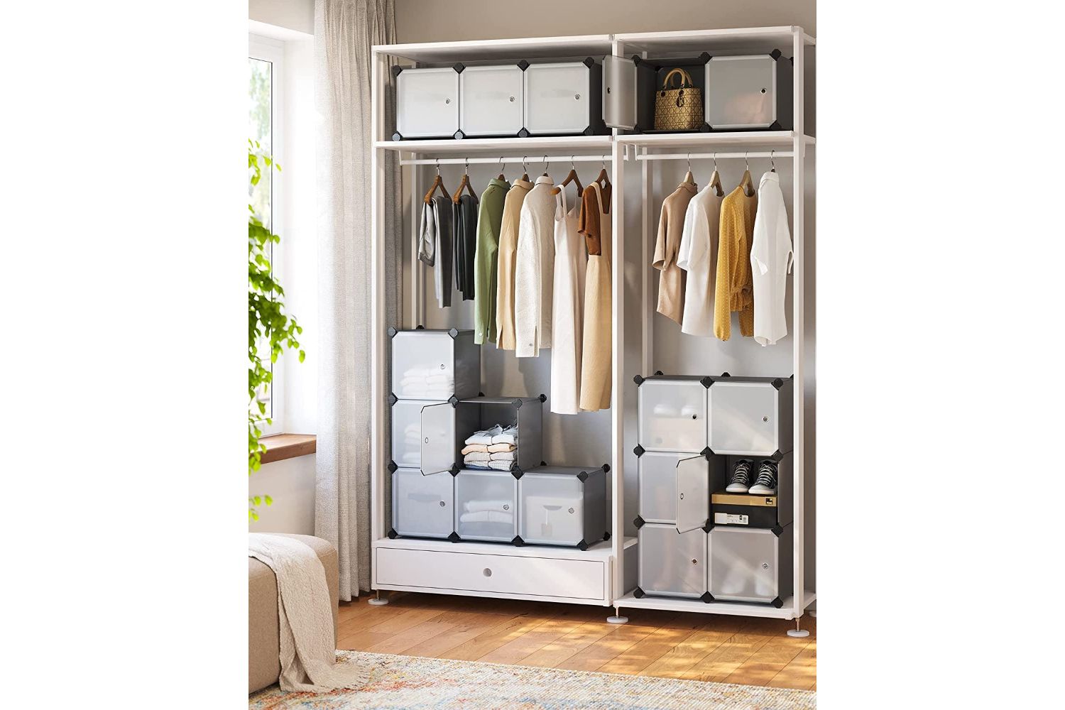Build the shelving unit in steps and place it under your stairs in the hallway to store shoes and bags. Place the shelf system upright in your bedroom and use it as a wardrobe. Split the 16 cubes and set 3 small shelves in rooms with limited space. Place about a cupboard with 6 cubes in your bathroom to keep all your hygiene items tidy. Use the plug-in shelf system to create a spacious run for hamsters, guinea pigs, house rats etc. to build.