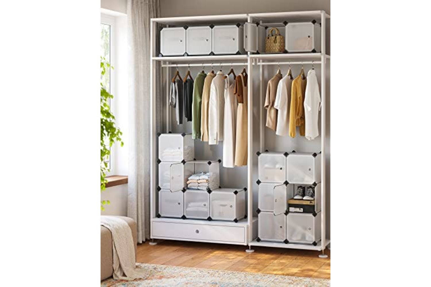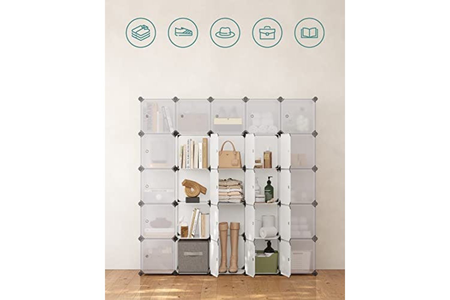 Songmics 16 Cube DIY Plastic Shelving System Wardrobe with Stylish White Doors Sturdy and Easy to Assemble Boltless Shelves LPC44BS