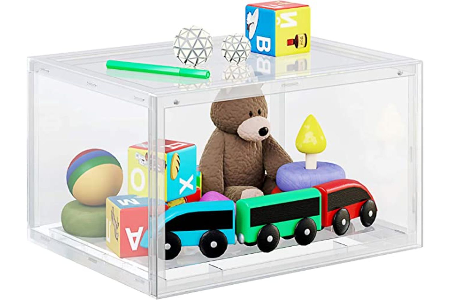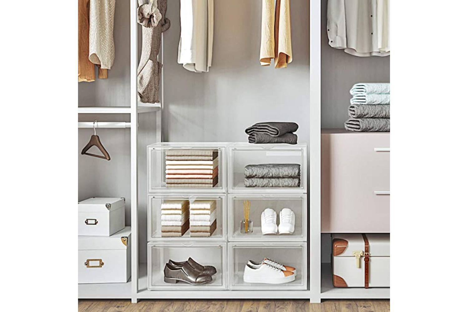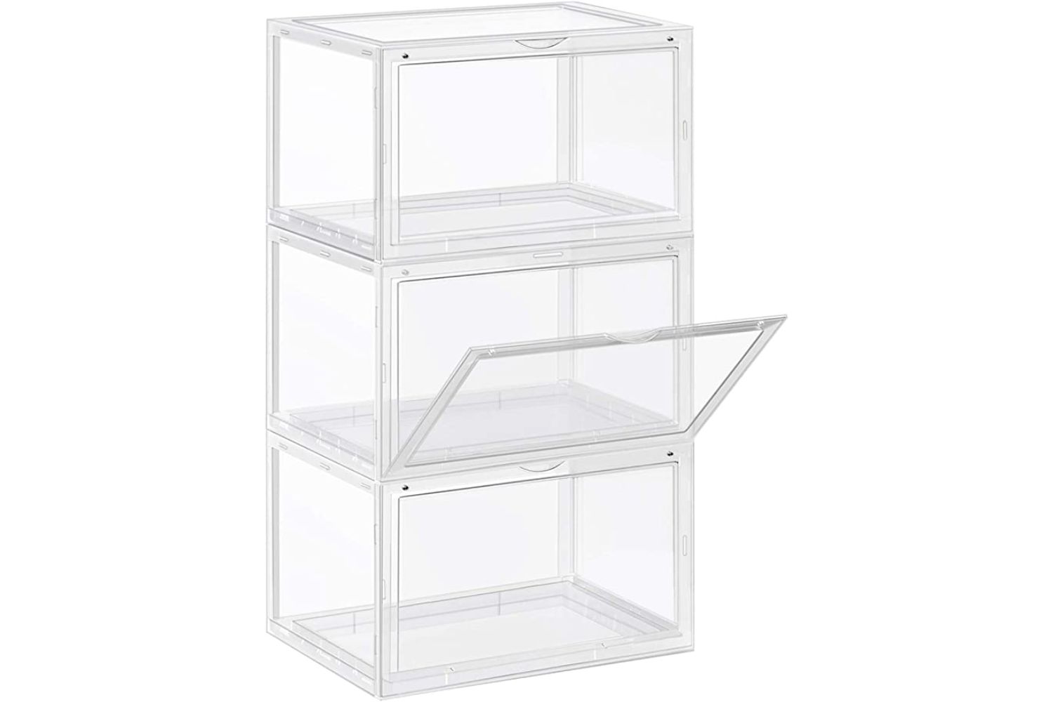 Do you know where your white sneakers are? Your dressy shoes? These clear shoe boxes take the guesswork out of finding the pair you want with their large clear drop front doors and see-through bodies—just grab your shoes, and go.