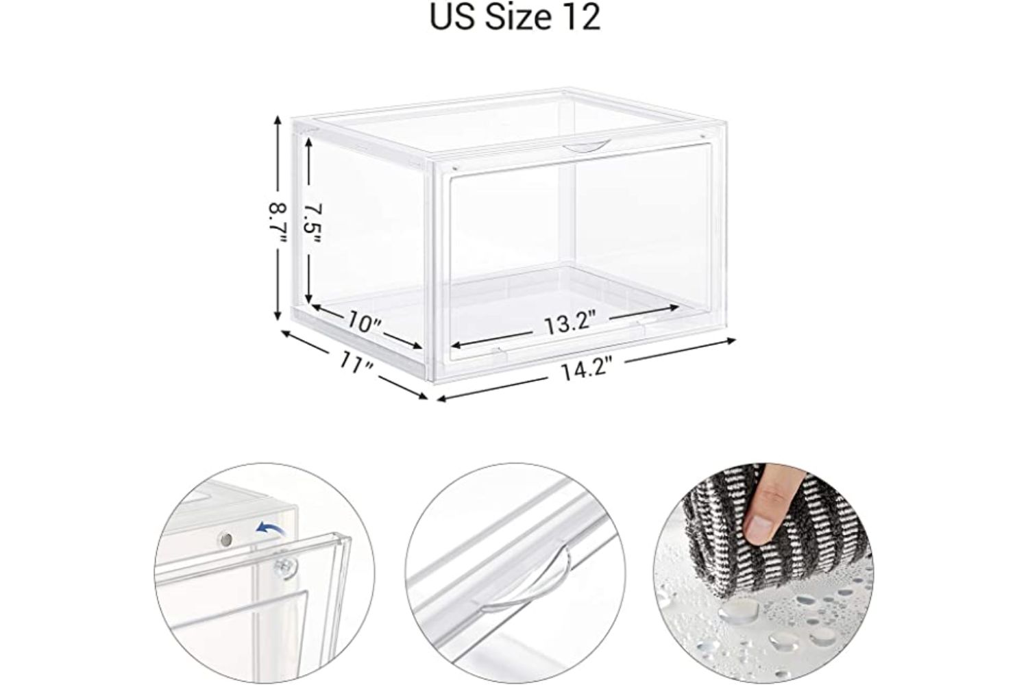 With all types of shoes in mind, the boxes fit shoe up to US size 12 and perfectly display the sides of your sneakers, booties, or high heels in a charming way.