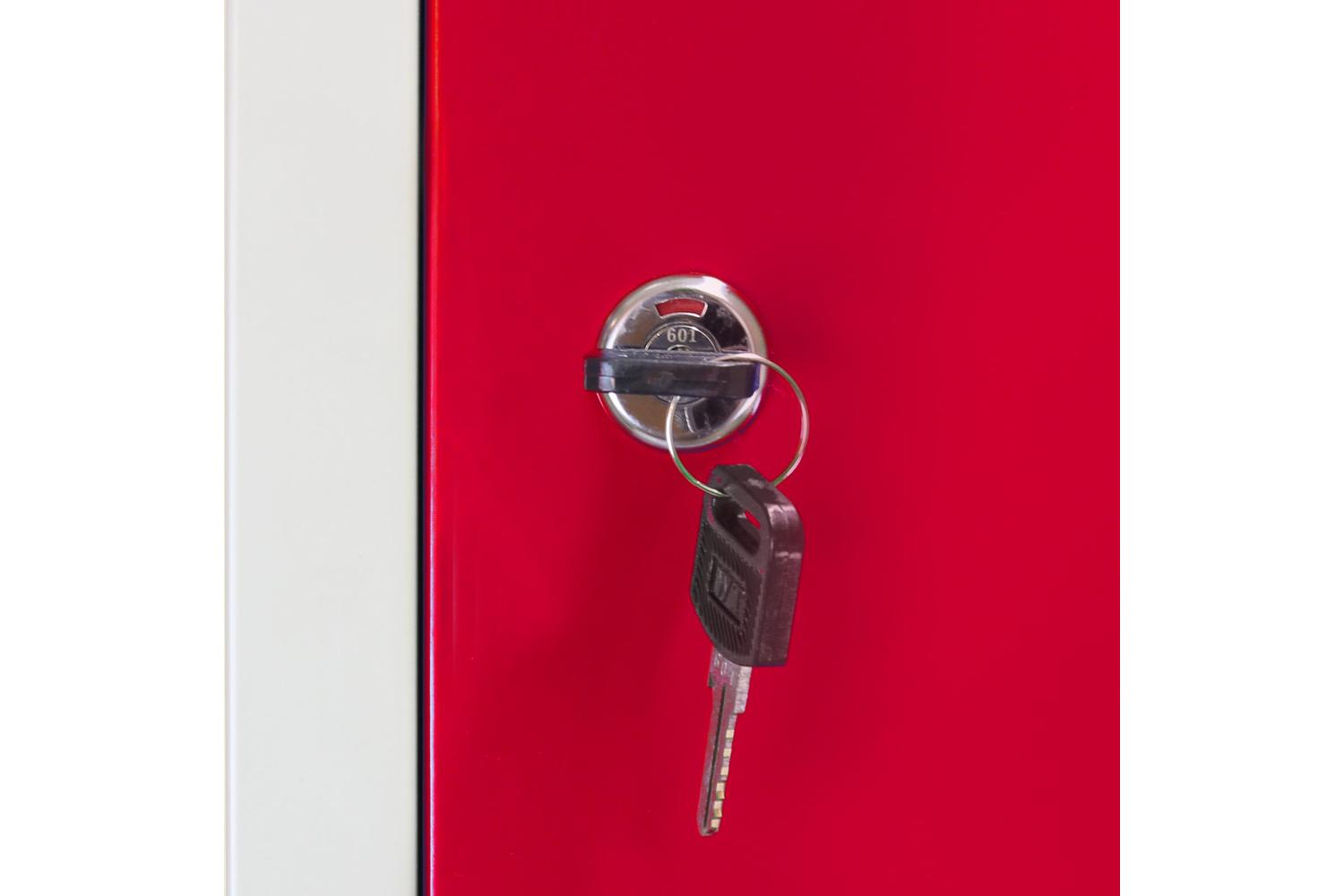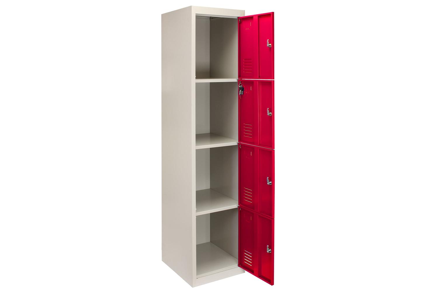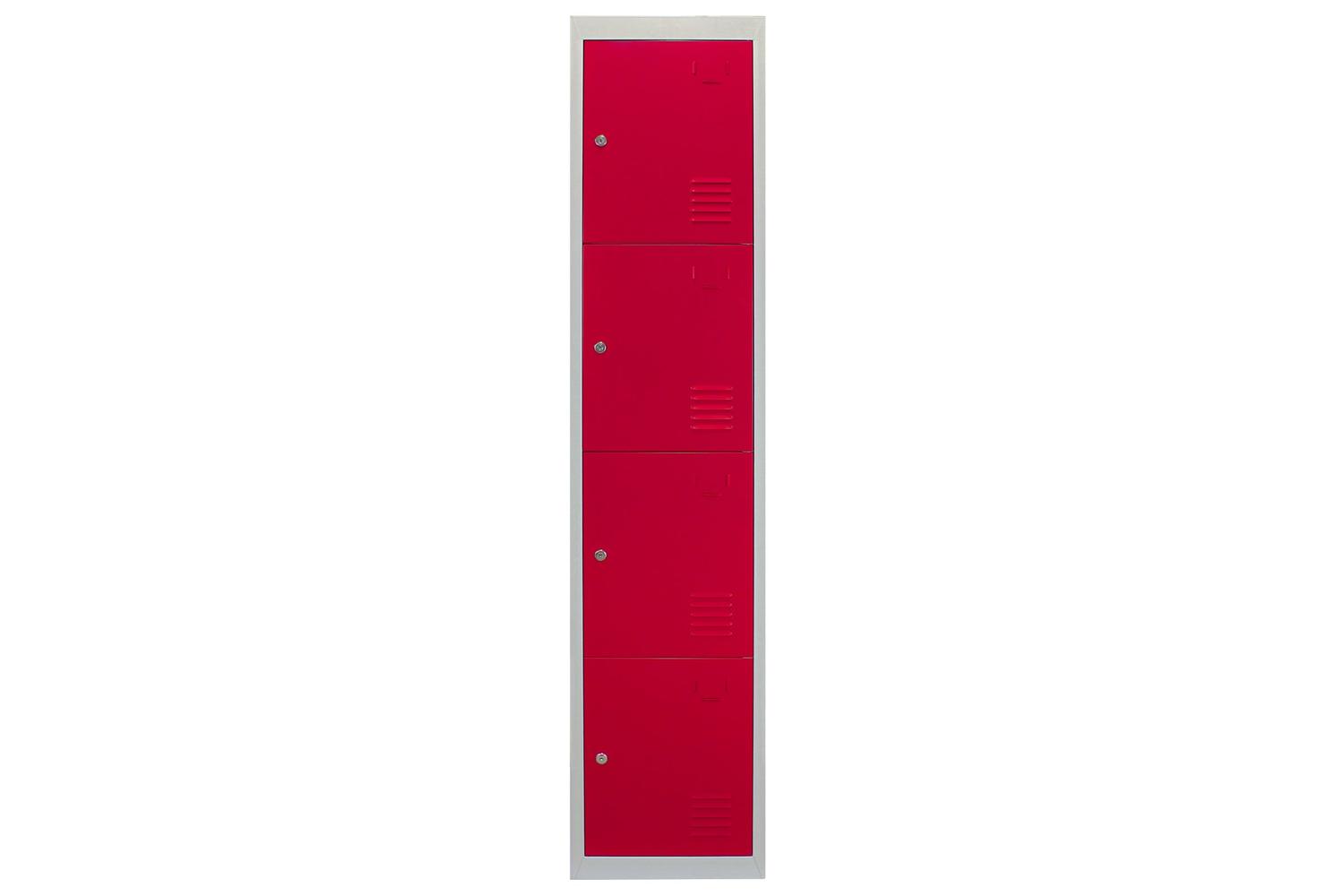 Flush with a robust frame coated with hard-wearing powder steel and sporting red doors, our storage solution lends your space a classic yet striking look. The dimensions of this quad door metal locker unit, standing at 180cm high, 45cm deep, and 38cm wide, offers ample capacity for staff, clients, or students. It allows everyone to stow their personal effects securely without crowding each locker, sparking confidence in your storage system's security and roominess.
