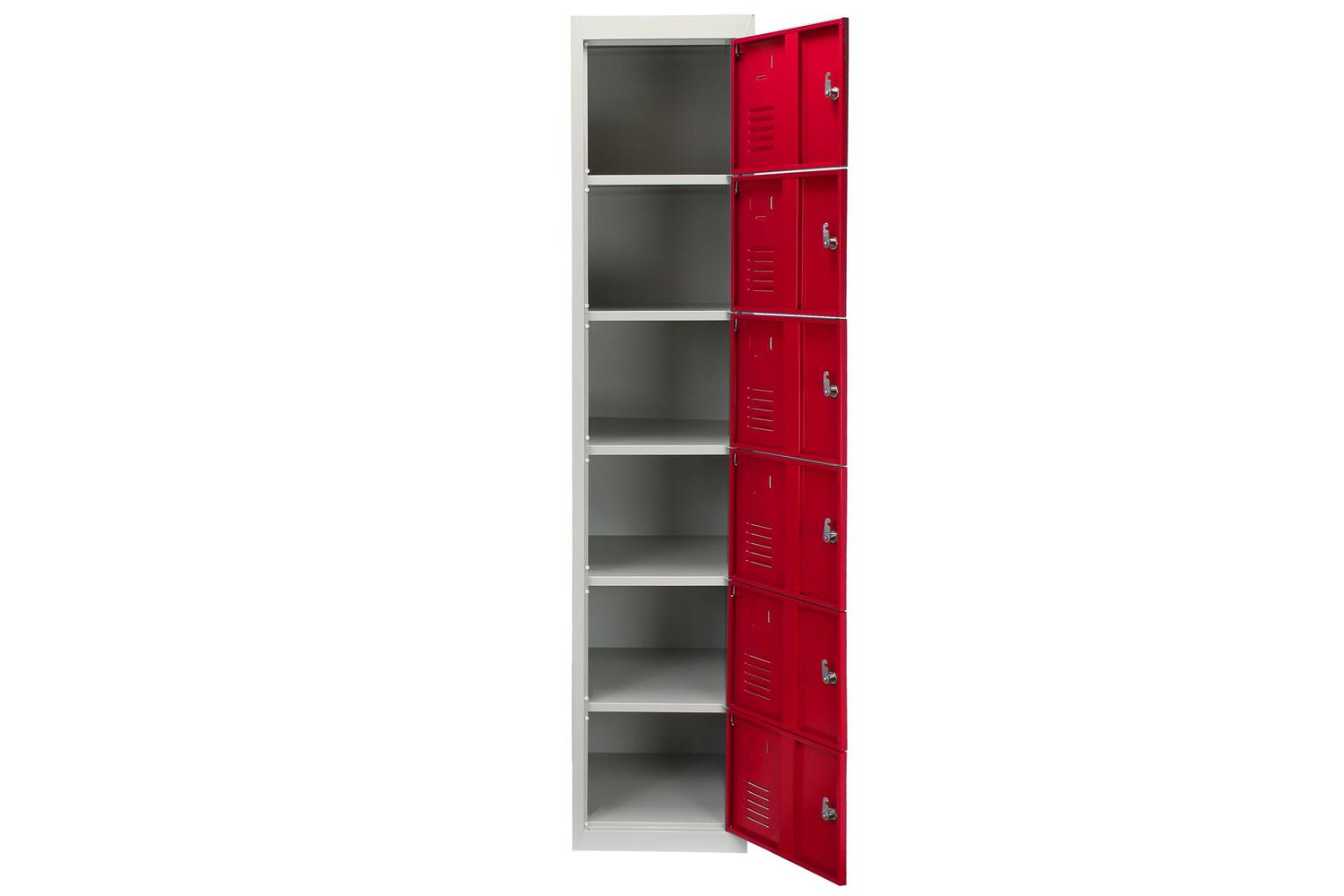 Constructed with high-quality powder-coated steel, this six-door metal locker personifies durability with striking red doors and a sleek grey body. The locker runs the dimensions of 45cm D x 38cm W x 180cm H - ample and versatile enough to easily adapt to different environments while offering a generous personal storage space.