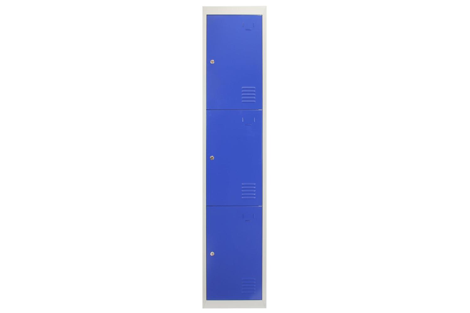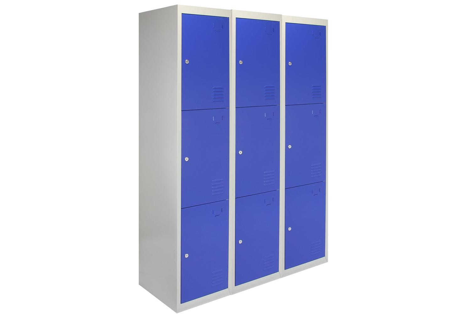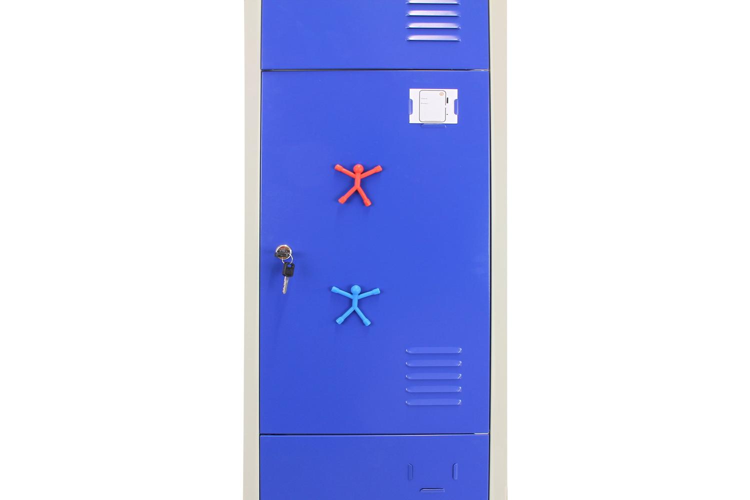 The lockers showcase a sturdy construction signified by their material durable steel. A cool grey body is beautifully contrasted with vibrant blue doors, finished with premium-grade powder-coat paint adding a touch of colour to any room.