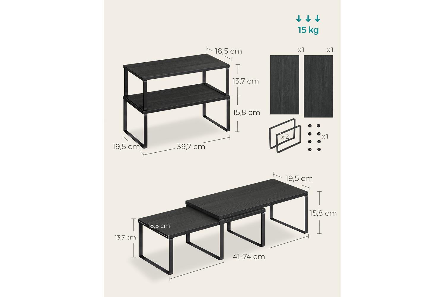 - Each shelf holds up to 15 kg