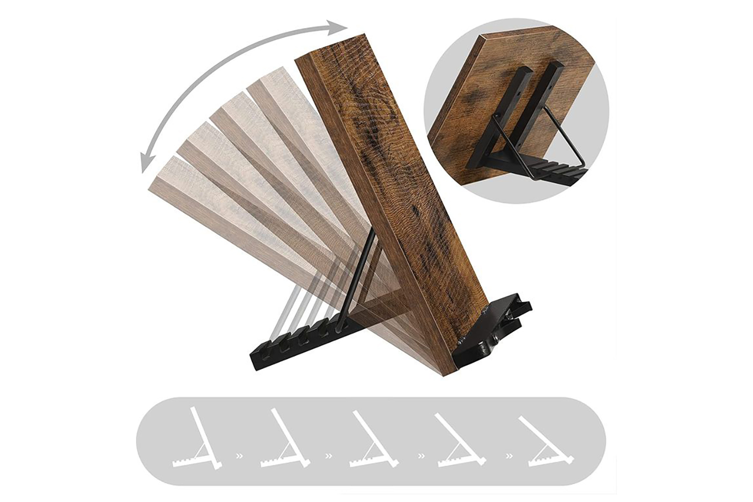 What’s in the Box? A rustic brown book holder with 2 clips to fix the pages, 5 adjustable angles to fit your varying needs, and many possibilities in your kitchen, study, and office