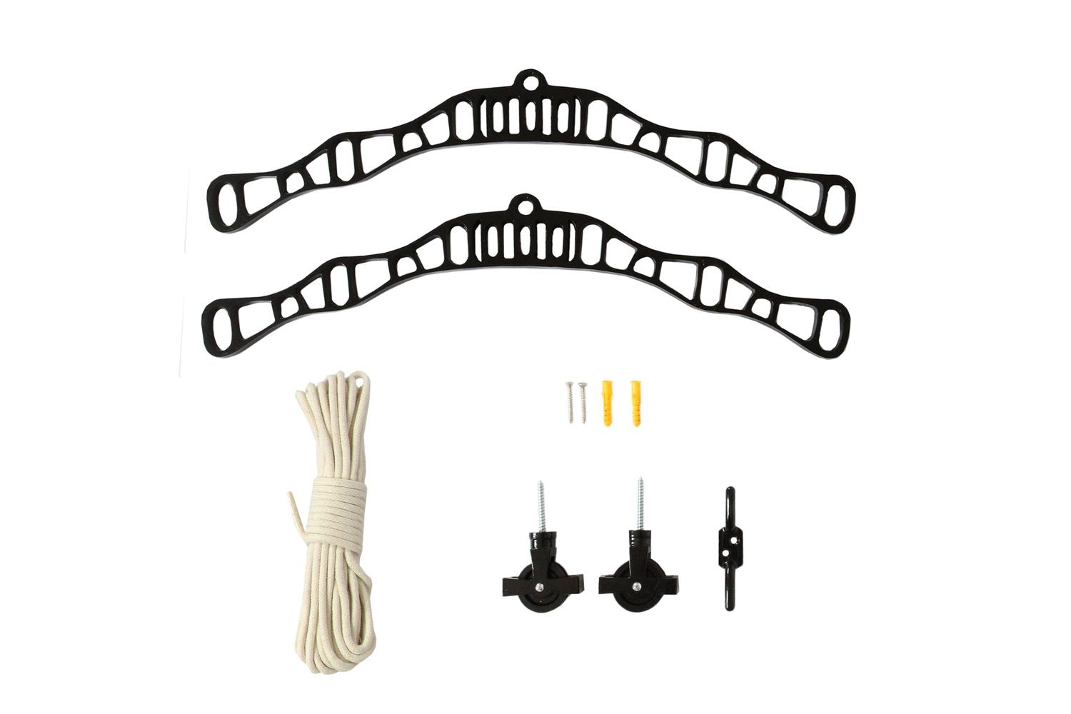 - Material: ethically-sourced pine, powder-coated cast-iron rack ends, pulleys and wheels, cotton rope