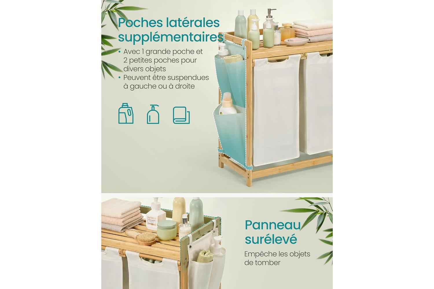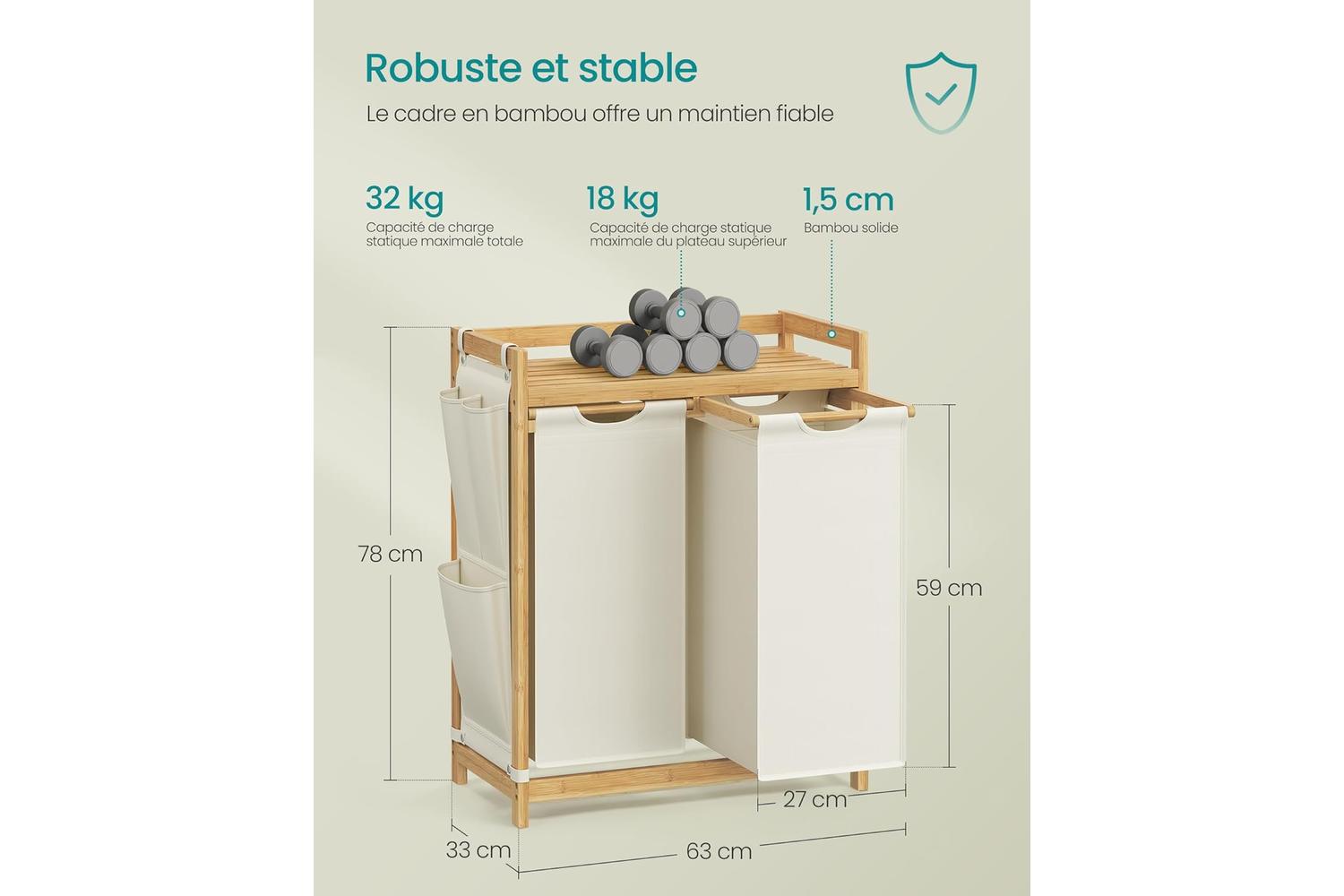 Practicality meets innovation with the integrated tray and handy side pockets. Store your detergents, fabric softeners, or pegs within easy reach, while the side tray protection keeps your essentials from falling out. The robust bamboo frame supports up to 32kg, providing stability and peace of mind, even when the basket is full. Whether you are managing a busy family household or looking for a stylish solution for your apartment, this laundry basket is built to last and designed to impress.