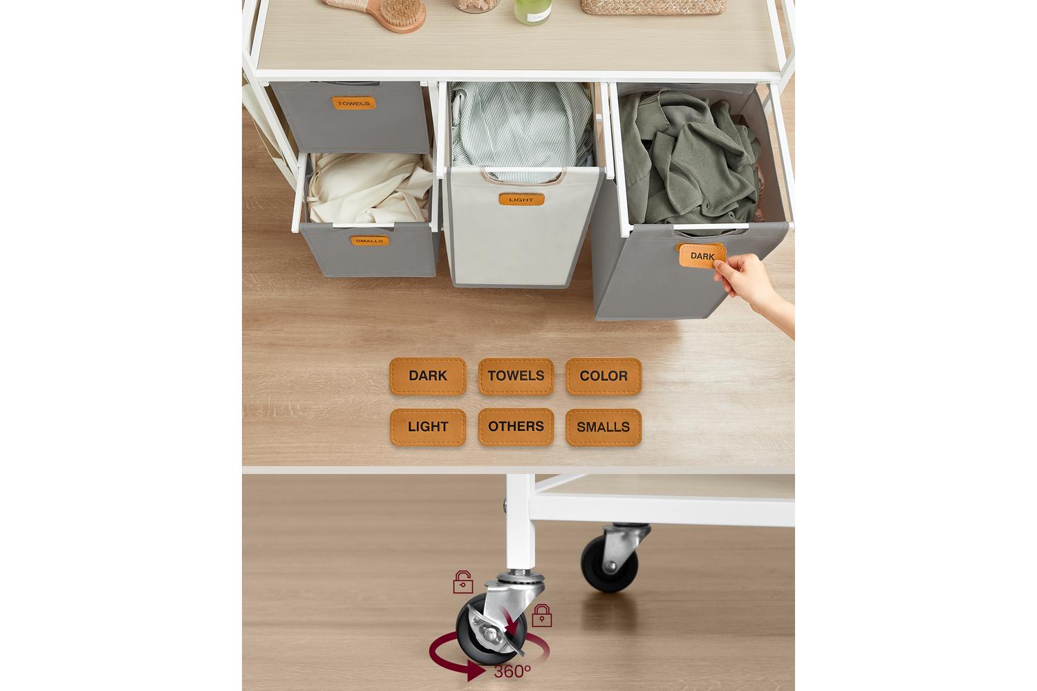Mobility is at the heart of this laundry basket's design. Equipped with four smooth-rolling casters—two of which lock for stability—you can easily move your laundry from room to room. Prefer a stationary setup? Simply swap the wheels for the included adjustable feet to keep your laundry cart securely in place. The removable bags, attached with sturdy Velcro fasteners and practical handles, make transporting laundry to the washing machine effortless.