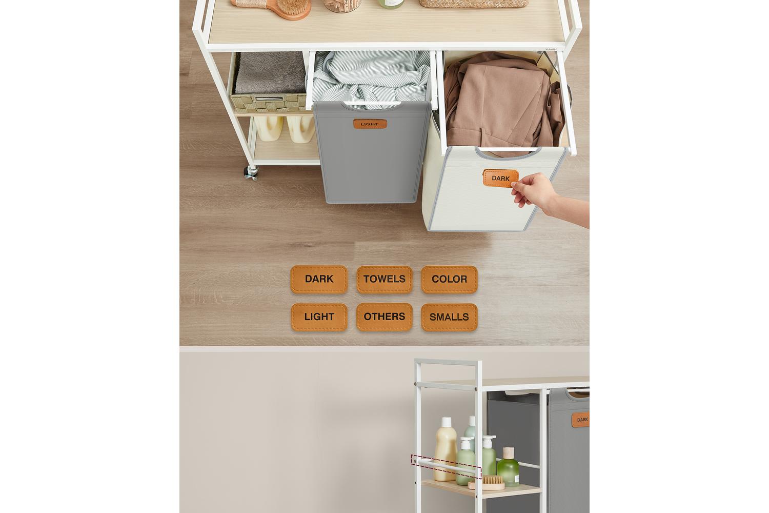 Organisation is at the heart of this laundry cart. With three spacious shelves, you have ample room to store detergents, fabric softeners, laundry nets, and other essentials. The included set of six labels and colour-coded bags make sorting whites, colours, and delicates a breeze, helping you keep your laundry routine streamlined and stress-free. The hook-and-loop closures ensure the labels are easy to attach and adjust as needed, while the practical handles on each bag make removal and transport simple.