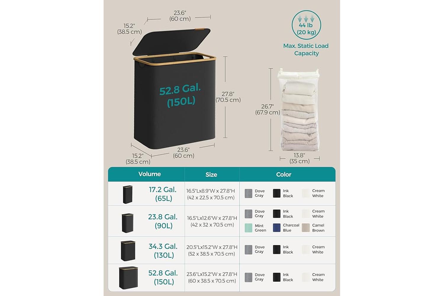 - Spacious 60 x 38.5 x 70.5 cm size holds up to 20 kg of laundry