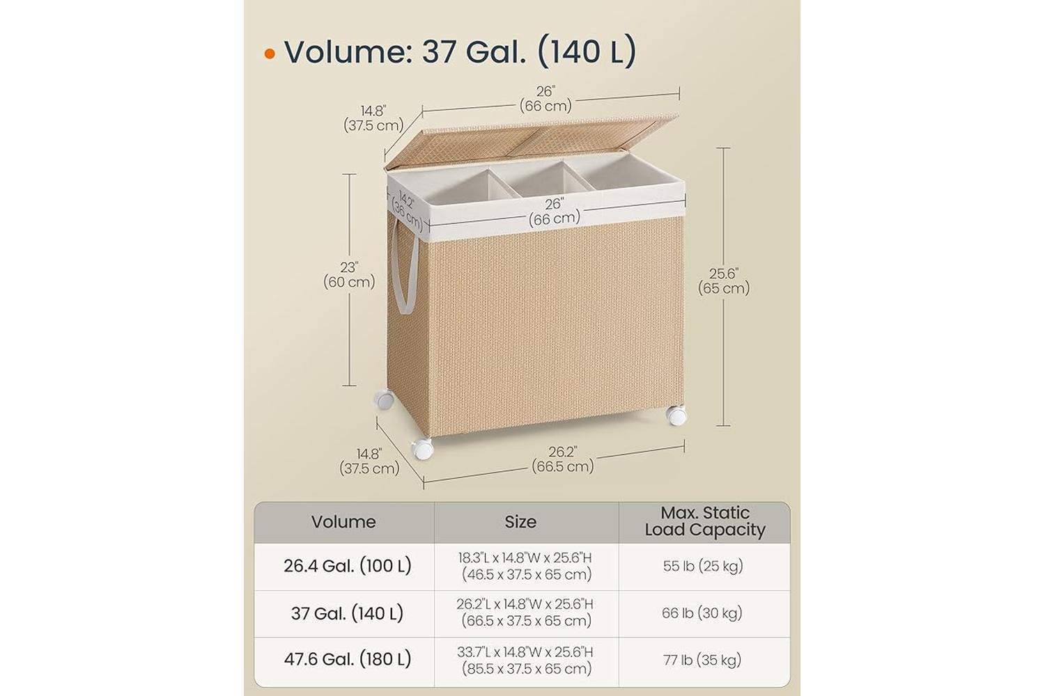 - Spacious 66.5 x 37.5 x 65 cm size holds plenty of laundry