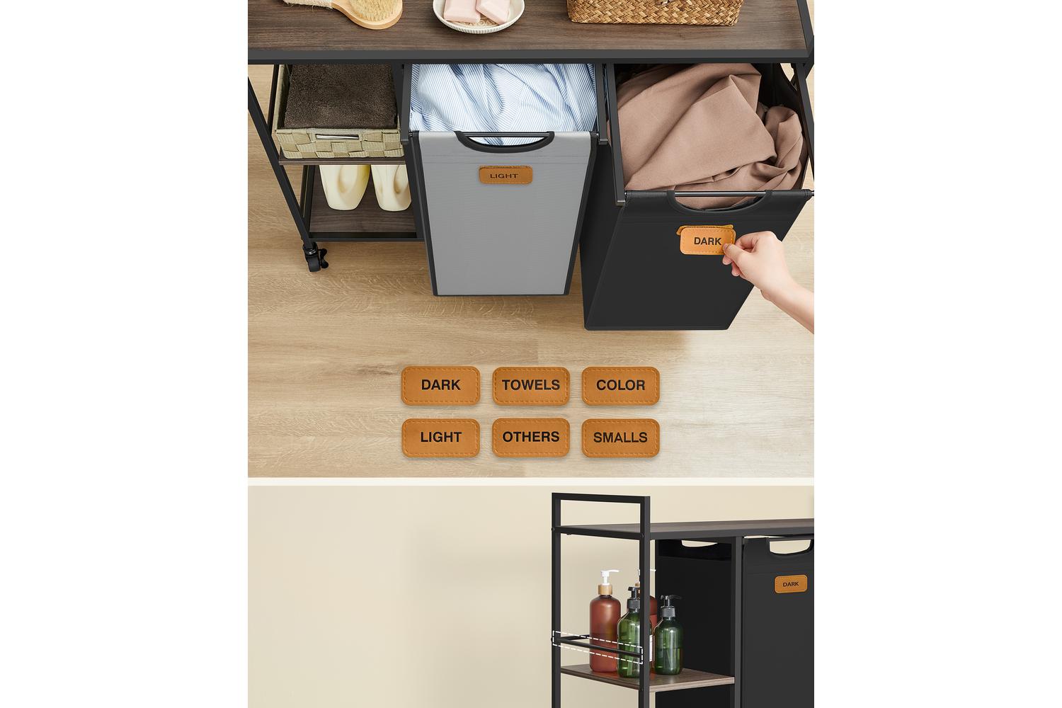 With two spacious 50L removable baskets, you have a generous 100L total capacity to handle even the largest laundry loads. The three integrated shelves provide ample storage for laundry detergent, fabric softener, and all your essential laundry accessories, keeping everything you need within easy reach. The included set of six Velcro labels makes sorting by colour or fabric type effortless, helping you keep whites, colours, and delicates separate and organised.