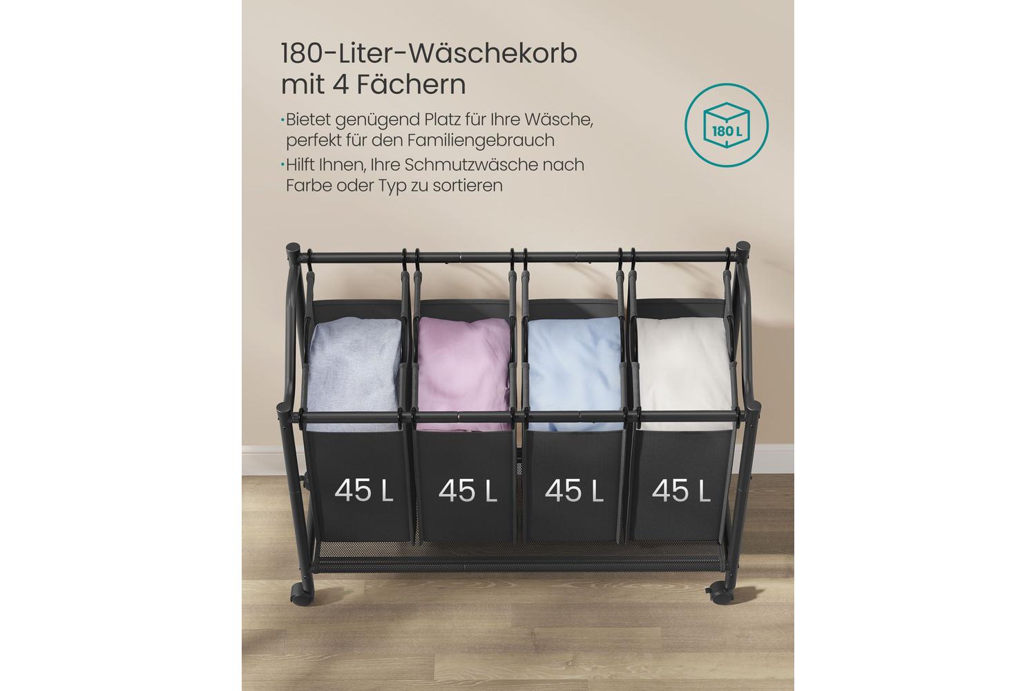 Presenting an impressive 180-litre storage capacity, this convenient laundry solution has ample space to store all your family's washing in one place. Equally practical, the four individual removable bags make sorting laundry by colour or type convenient and quick, saving valuable time from sifting through unsorted piles. Wave goodbye to lengthy sorting with simple, steady, and seamless laundry organisation.