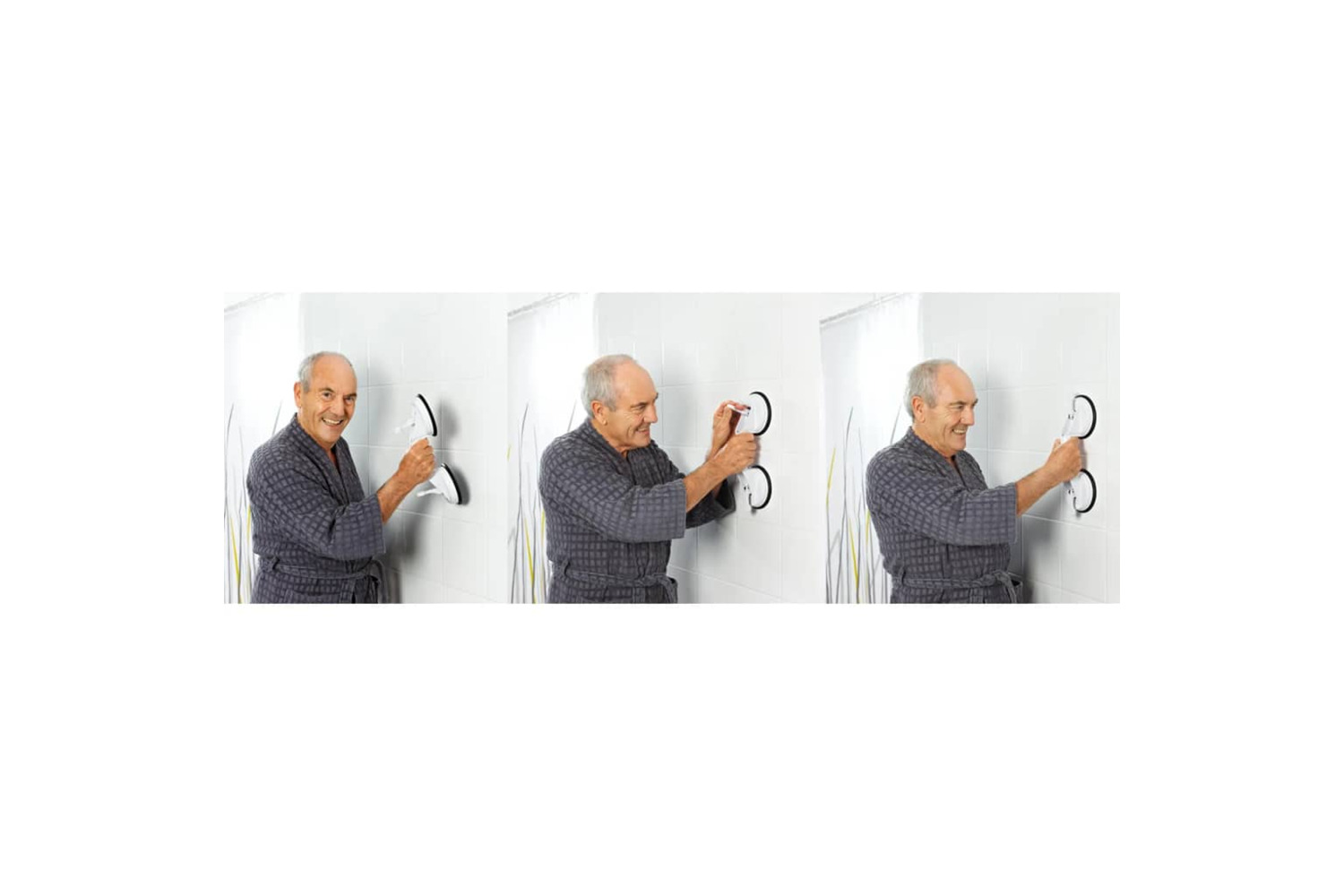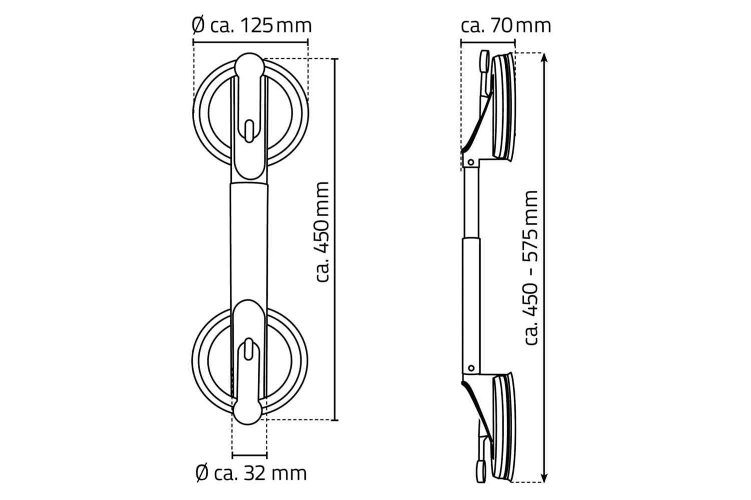 The removable grab bar consists of a telescopic handle out of high-strength plastic (ABS) and two strong synthetic rubber suction cups. The grip has an ergonomic design and its length can be extended from approximately 445 mm to 575 mm. The suction cups allow you to easily mount the grab bar on any smooth surface without the need for drilling, which facilitates use in different areas like in the bathroom or toilet.