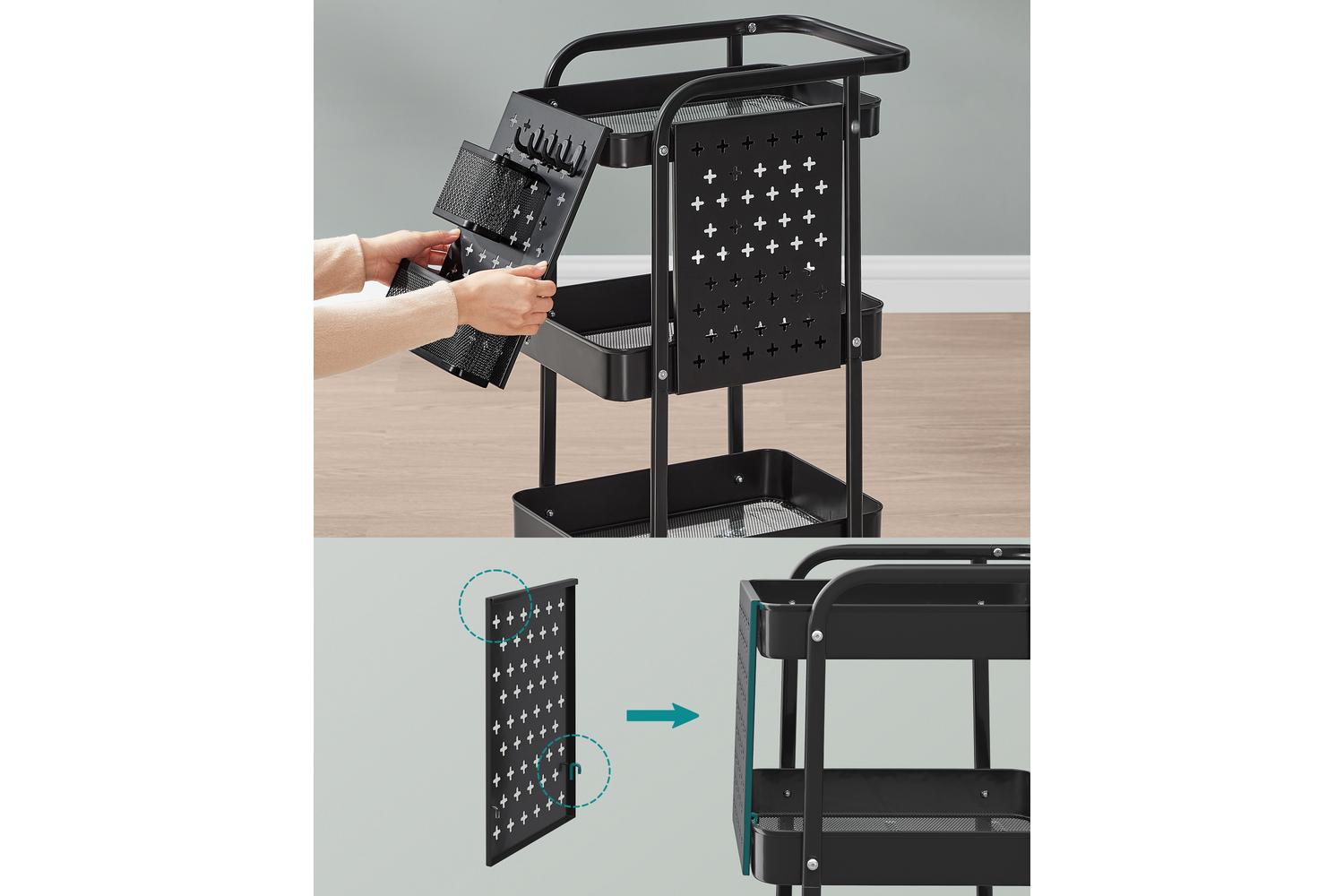 Organisation is made effortless with two metal storage racks and four handy hanging hooks, perfect for keeping tools, utensils, or accessories within arm's reach. The two removable pegboard panels can be attached to either side of the cart, allowing you to customise your storage setup to suit your needs. Whether you are a DIY enthusiast, a busy parent, or a creative professional, this cart offers the flexibility to organise your space your way.