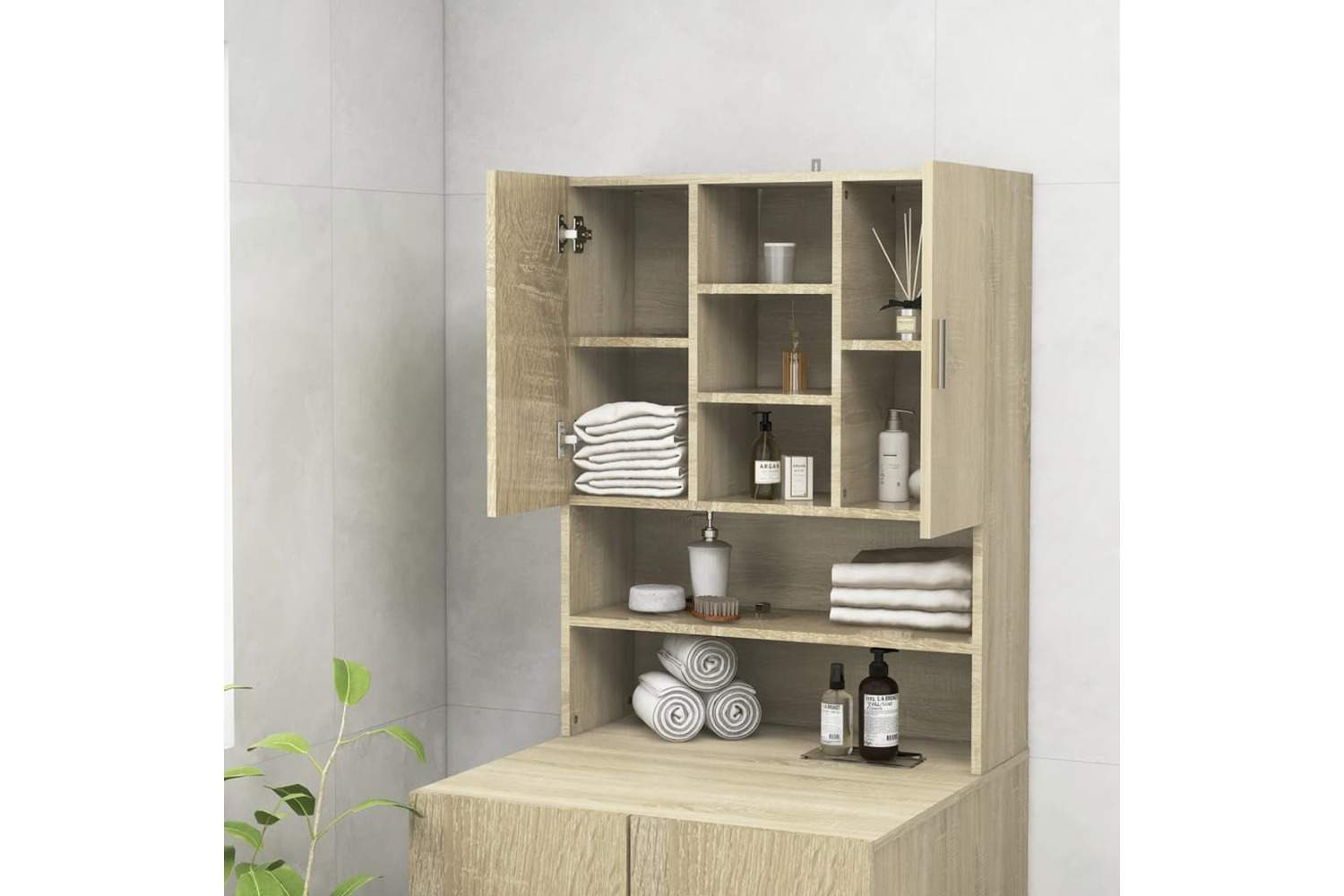 With this washing machine cabinet, you can create and optimally use additional storage space in the bathroom. The clean lines and sleek design make it blend into your bathroom perfectly.