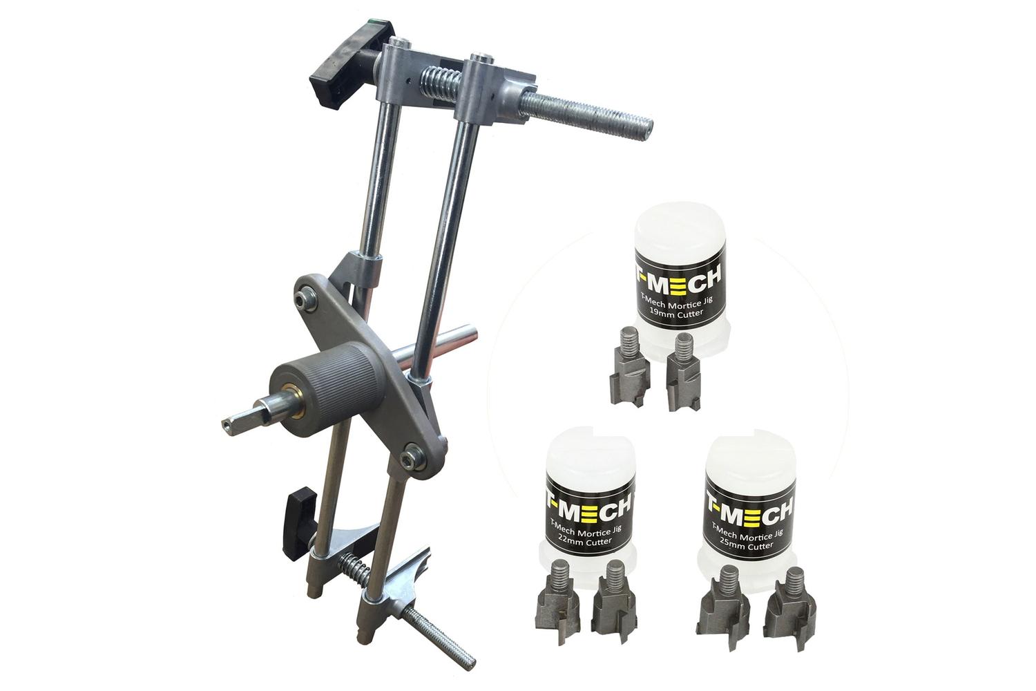 The T-Mech Mortice Jig arrives complete with a bonus of 6 carbide wood cutters possessing different sizes (2x19mm, 2x22mm, 2x25mm) neatly packed into a carry case. Consequently, apart from a drill, you require nothing else to get cranking.