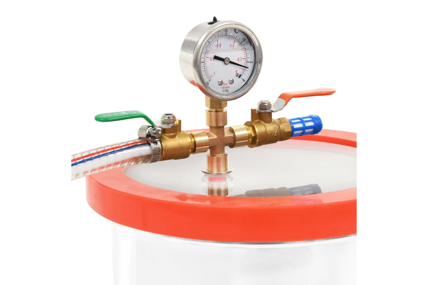The degassing chamber is well-sealed to prevent leaks and provide a safe, reliable means for degassing. The stainless steel material ensures its resistance to wear and pressure. Additionally, the extra thick, transparent acrylic lid, which will not bend in vacuum operations, allows better observation of the whole degassing process. Besides, the silicone oil vacuum gauge and shock-resistant vacuum meter are equipped for better monitoring. The steel hose can withstand great pressure as well.