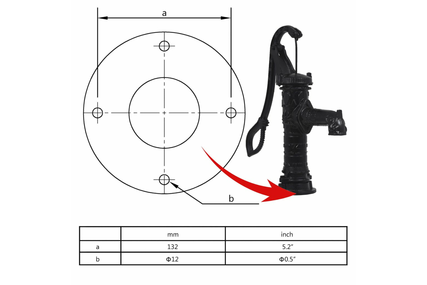 - Suitable for most cast iron hand pumps with 4 x 12 mm mounting holes