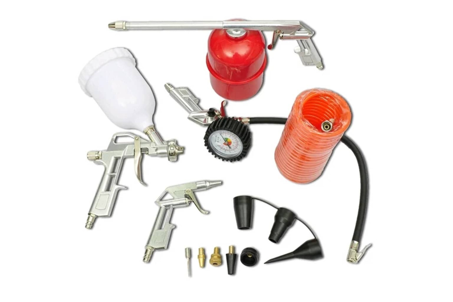 This all-in-one multi-purpose tool kit includes different tools for many applications, such as spraying paint, inflating tyres, blowing off dust and cleaning, etc. A 5m spiral hose for easy maneuverability is also included.