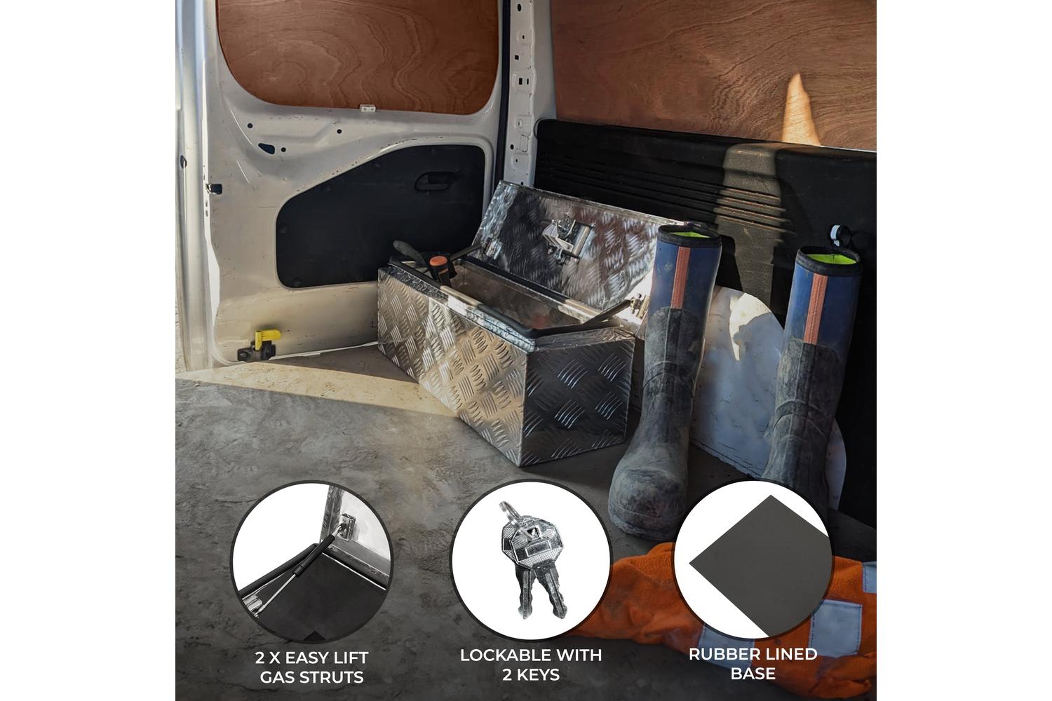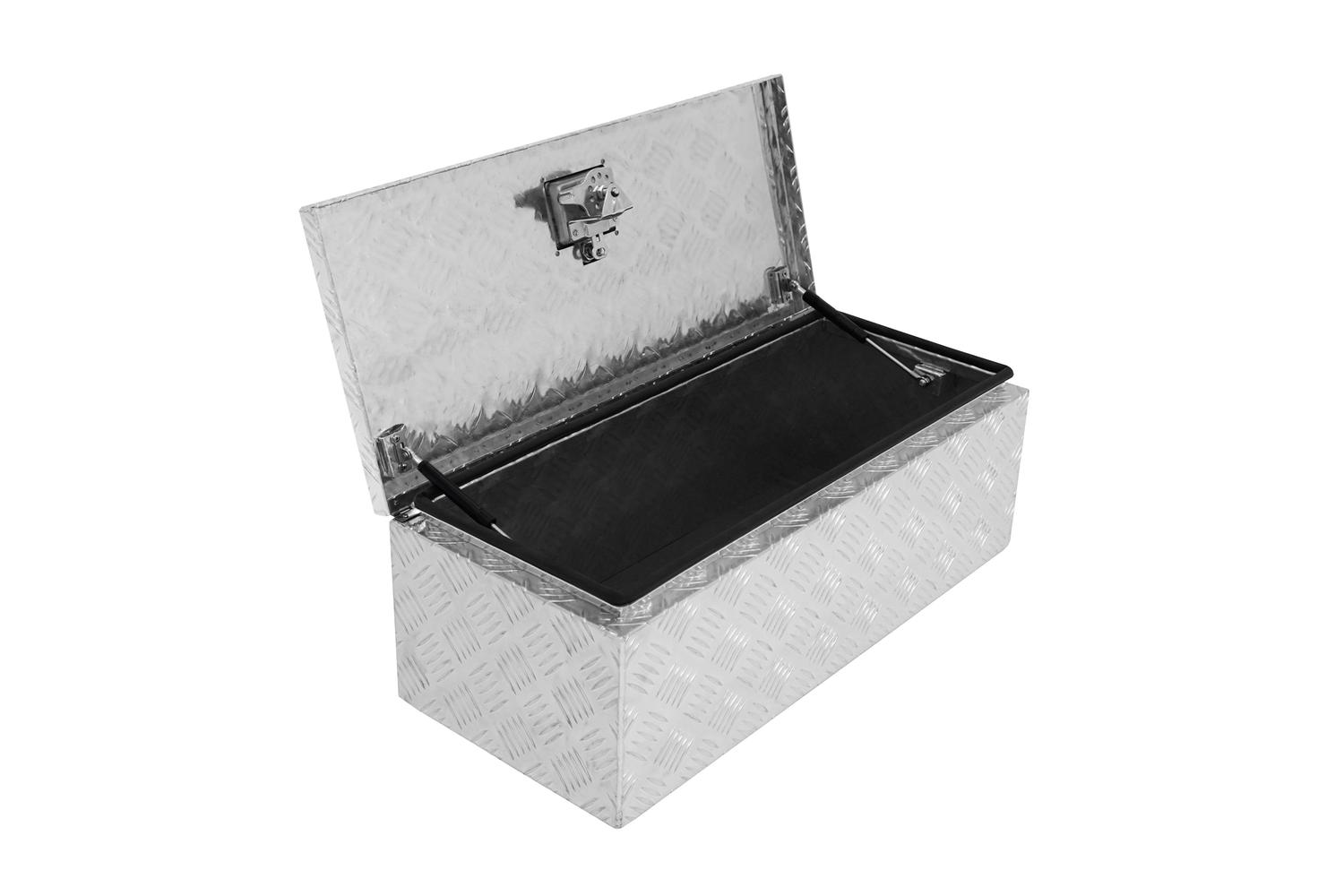 Constructed from aluminium checker plate, this tool box is engineered for maximum strength and durability. Its fully waterproof design, complete with a rubber seal around the lid and opening, prevents water and dirt from entering, ensuring all items inside remain clean and dry. The robust welded construction further enhances its durability, making it a reliable companion for tough environments.