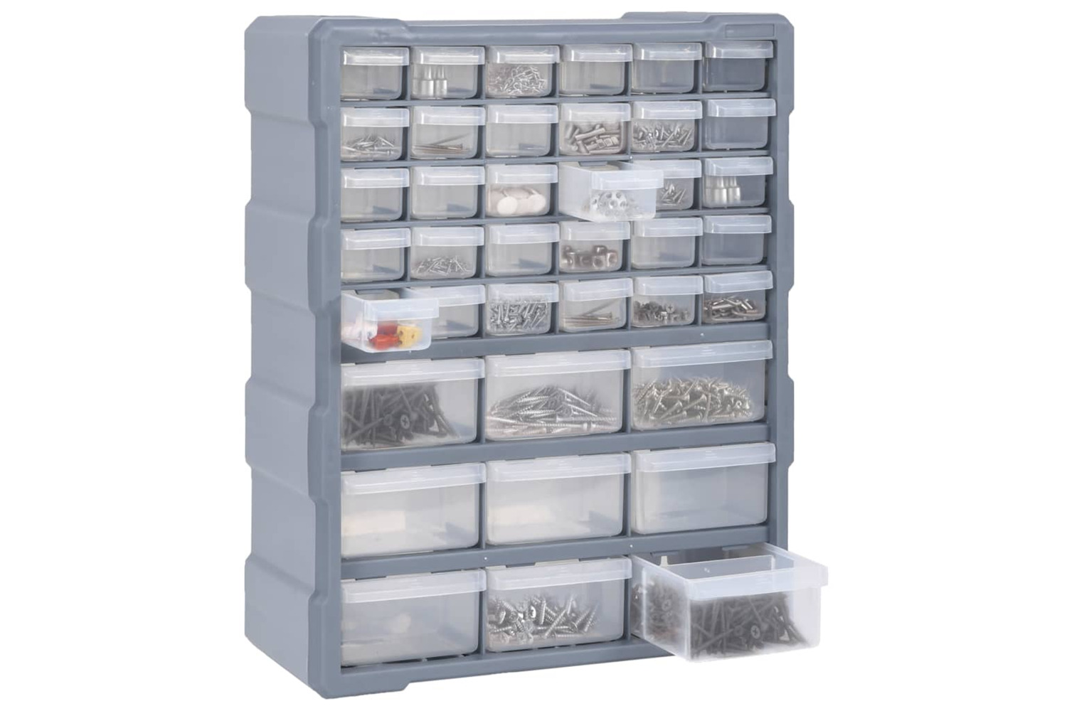 This storage unit contains 30 small drawers and 9 middle drawers to meet your different needs. It keeps your hand tools and accessories like fasteners organised and within reach. The tool cabinet is made of impact-resistant plastic, which is both durable and stable. The drawers are made of see-through plastic so that you can quickly identify the contents. This craft box is ideal for storing nuts, bolts, screws, nails, general fixings and components.