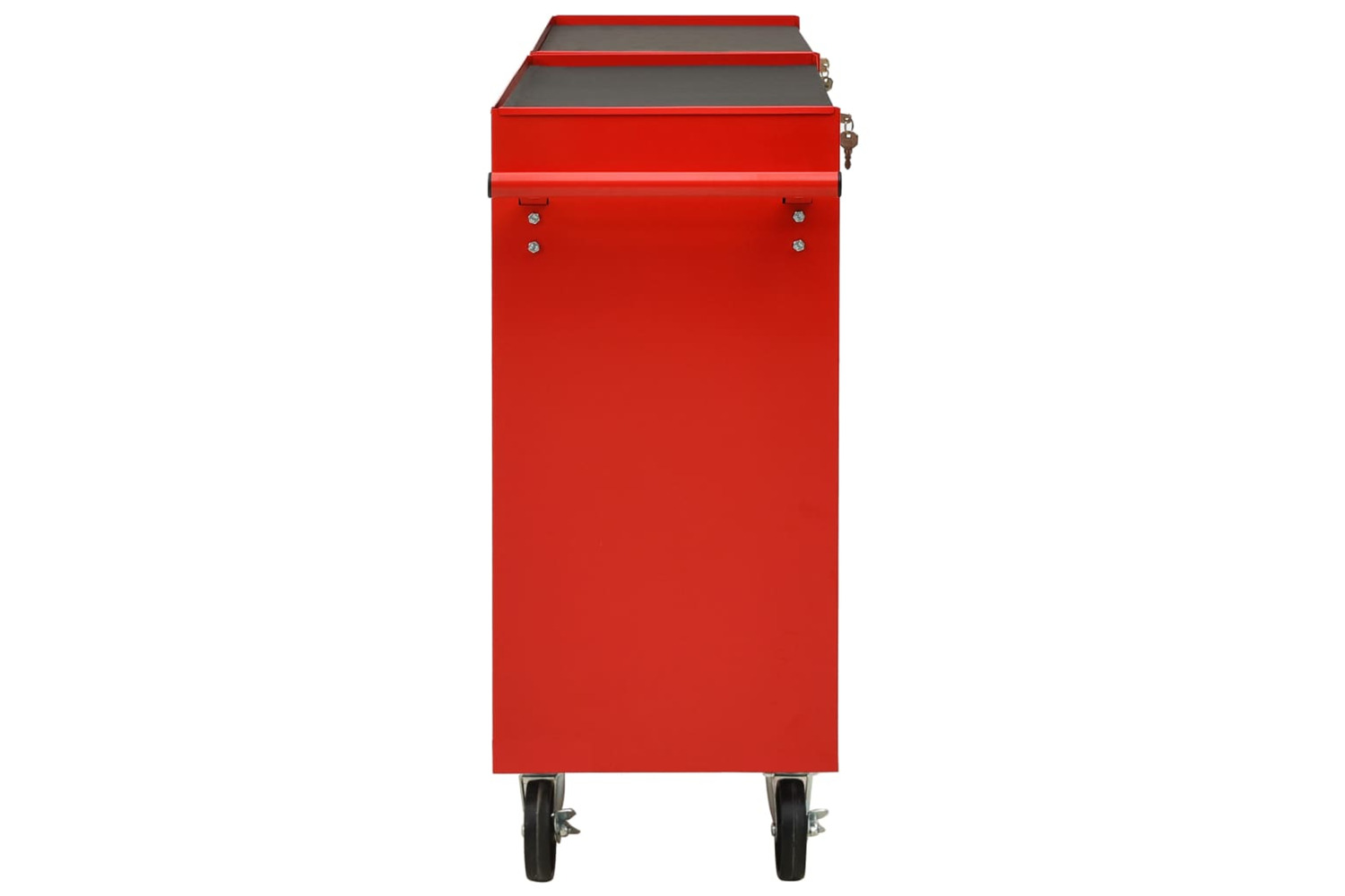 Made of sturdy steel, the workshop tool trolley has a robust and durable construction. Thanks to the integrated locks, drawers can be locked at once to prevent them from opening accidentally when the trolley is moved. Each drawer has a non-slip bottom lining to keep your tools in place. The robust countertop on the tool box is a great spot to keep frequently-used tools within reach. With four swivel castors, two of which have brakes, the trolley can be moved around easily. There are two convenient side handles for pushing the trolley.